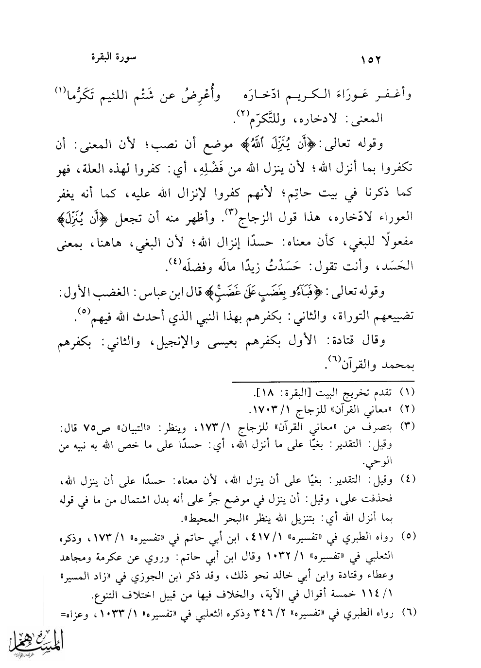 (¬3) بتصرف من "معاني القرآن" للزجاج 1/ 173، وينظر: "التبيان" ص 75 قال: وقيل: التقدير: بغيًا على ما أنزل الله، أي: حسدًا على ما خص الله به نبيه من الوحي.