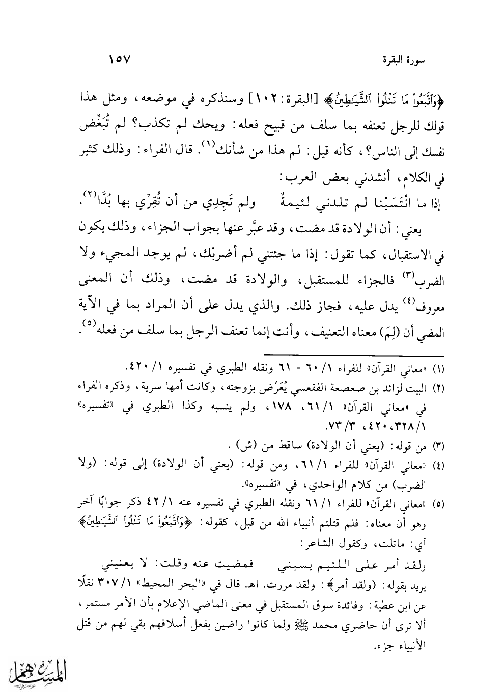 (¬1) "معاني القرآن" للفراء 1/ 60 - 61 ونقله الطبري في تفسيره 1/ 420.