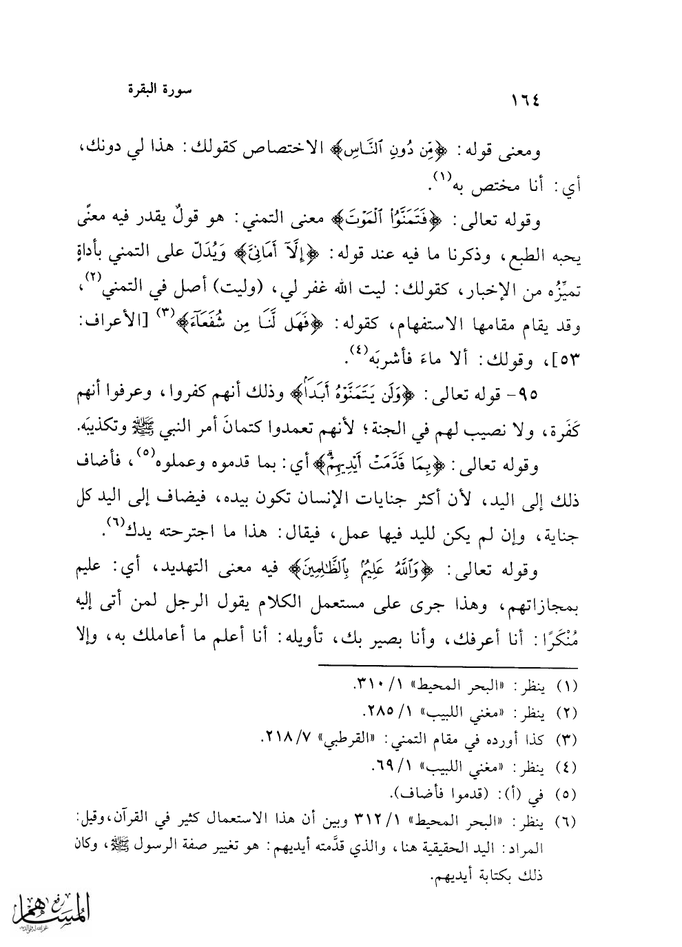 (¬6) ينظر: "البحر المحيط" 1/ 312 وبين أن هذا الاستعمال كثير في القرآن، وقيل: المراد: اليد الحقيقية هنا، والذي قدَّمته أيديهم: هو تغيير صفة الرسول - صلى الله عليه وسلم -، وكان ذلك بكتابة أيديهم.