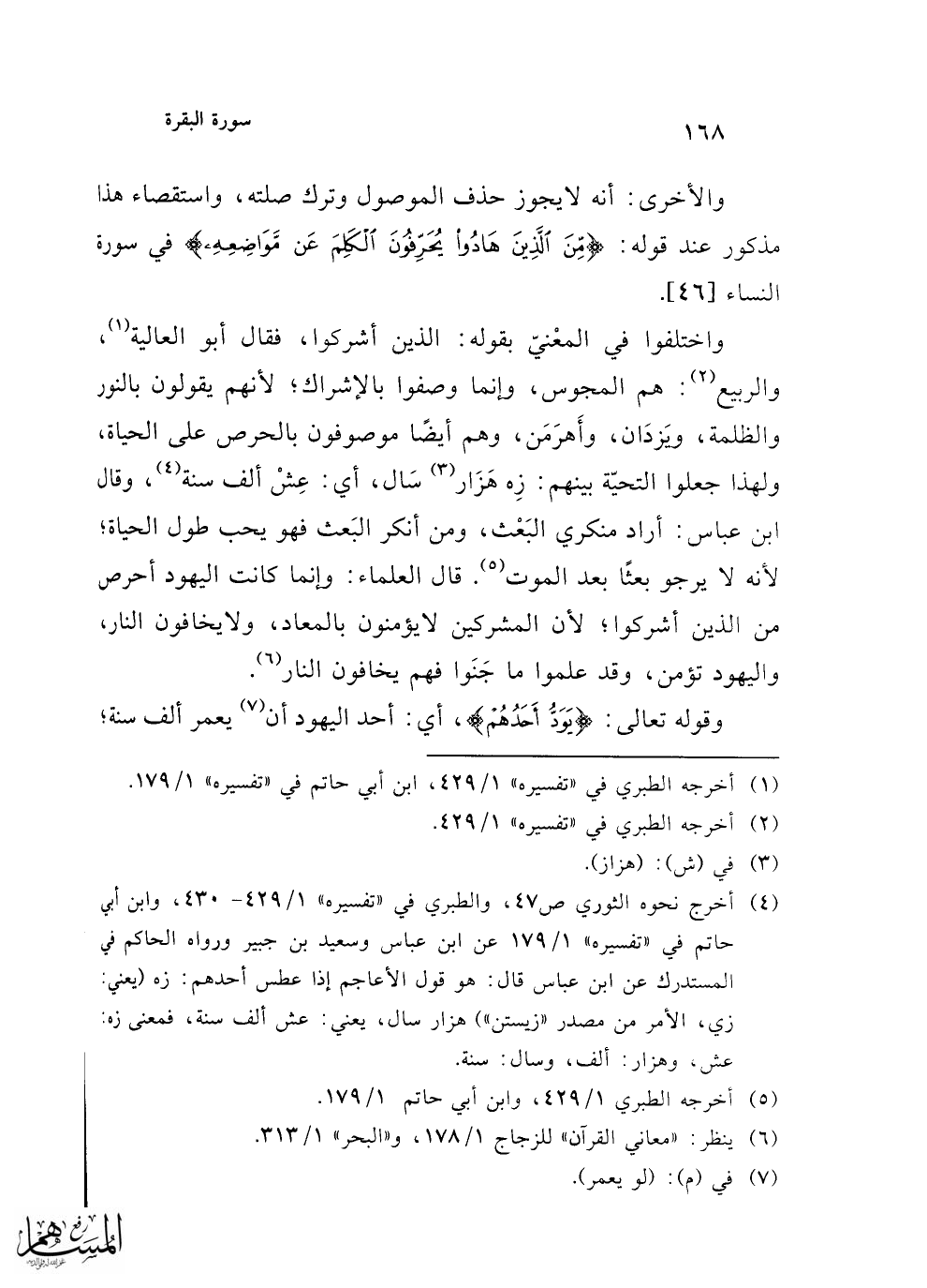 واختلفوا في المعْنيّ بقوله: الذين أشركوا، فقال أبو العالية (¬1)، والربيع (¬2): هم المجوس، وإنما وصفوا بالإشراك؛ لأنهم يقولون بالنور والظلمة، وَيزدَان، وأَهرَمَن، وهم أيضًا موصوفون بالحرص على الحياة، ولهذا جعلوا التحيّة بينهم: زِه هَزَار (¬3) سَال، أي: عِشْ ألف سنة (¬4)، وقال أبن عباس: أراد منكري البَعْث، ومن أنكر البَعث فهو يحب طول الحياة؛ لأنه لا يرجو بعثًا بعد الموت (¬5). قال العلماء: وإنما كانت اليهود أحرص من الذين أشركوا؛ لأن المشركين لا يؤمنون بالمعاد، ولا يخافون النار، واليهود تؤمن، وقد علموا ما جَنَوا فهم يخافون النار (¬6).