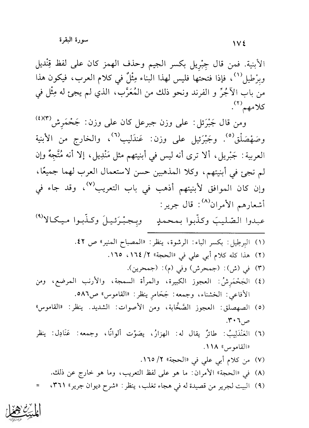 ومن قال جَبْرَئيل: على وزن جبرعل كان على وزن: جَحْمَرِش (¬3) (¬4) وصَهْصَلْق (¬5). وجَبْرَئيل على وزن: عَندَليب (¬6)، والخارج من الأبنية العربية: جَبْريل، ألا ترى أنه ليس في أبنيتهم مثل مَنْدِيل، إلا أنه مُتَّجِهٌ وإن لم تجئ في أبنيتهم، وكلا المذهبين حسن لاستعمال العرب لهما جميعًا، وإن كان الموافق لأبنيتهم أذهب في باب التعريب (¬7)، وقد جاء في أشعارهم الأمران (¬8): قال جرير: