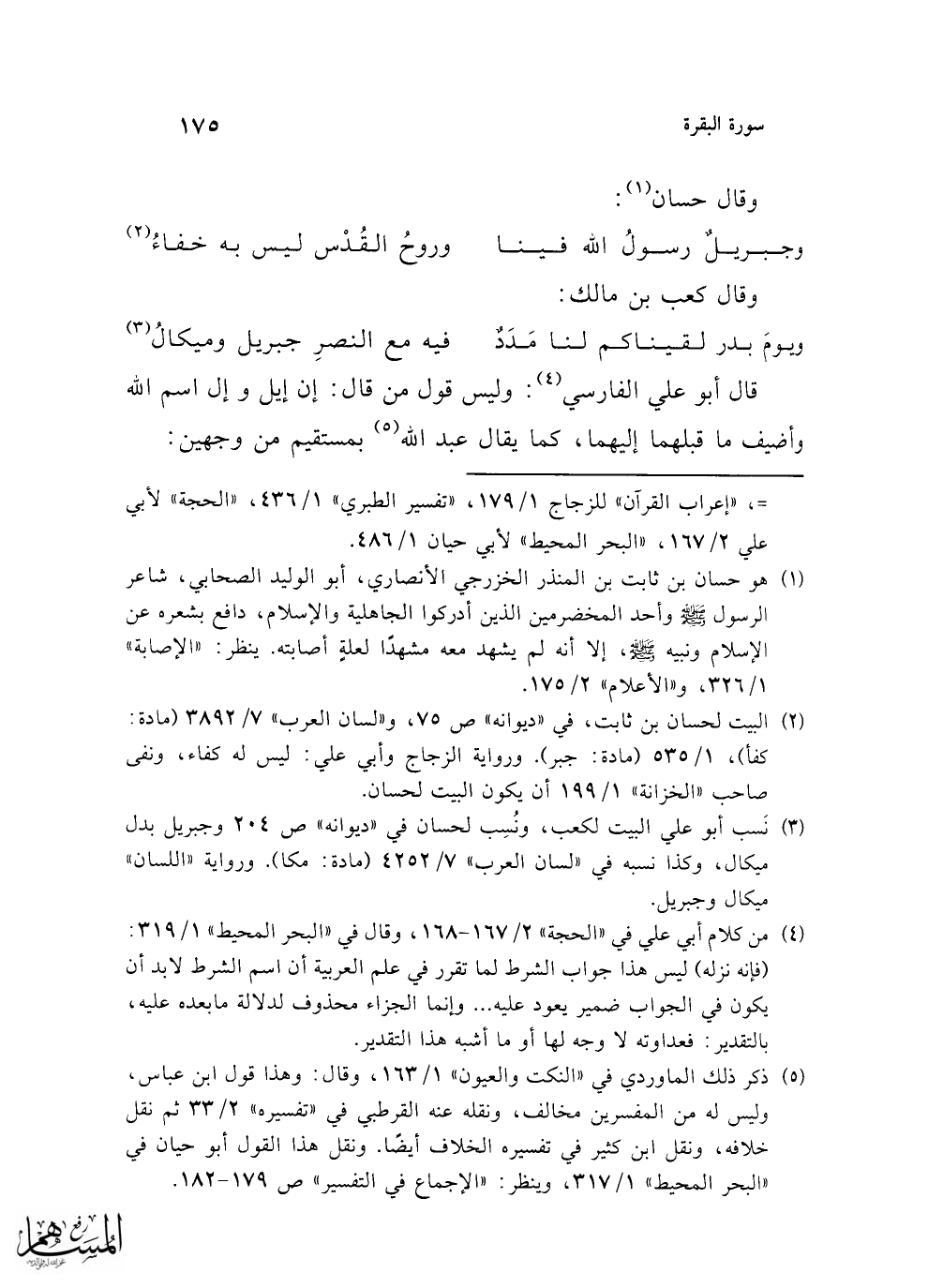 =، "إعراب القرآن" للزجاج 1/ 179، "تفسير الطبري" 1/ 436، "الحجة" لأبي علي2/ 167، "البحر المحيط" لأبي حيان 1/ 486.