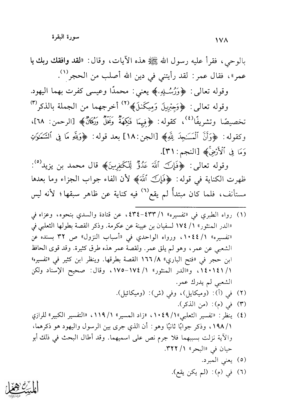 (¬1) رواه الطبري في "تفسيره" 1/ 433 - 434، عن قتادة والسدي بنحوه، وعزاه في "الدر المنثور" 1/ 174 لسفيان بن عيينة عن عكرمة. وذكر القصة بطولها الثعلبي في "تفسيره" 1/ 1044، ورواه الواحدي في "أسباب النزول" ص 32 بسنده عن الشعبي عن عمر، وهو لم يلق عمر. ولقصة عمر هذه طرق كثيرة. وقد قوى الحافظ ابن حجر في "فتح الباري" 8/ 166القصة بطرقها. وينظر ابن كثير في "تفسيره"
