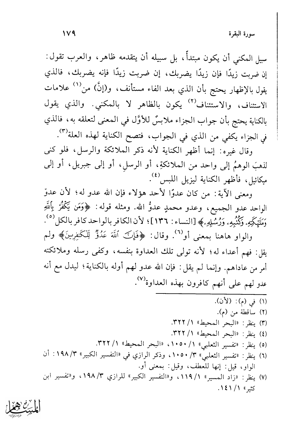 والواو هاهنا بمعنى أو (¬6). وقال: {فَإِنَّ اللَّهَ عَدُوٌّ لِلْكَافِرِينَ} ولم يقل: فهم أعداء له؛ لأنه تولى تلك العداوة بنفسه، وكفى رسله وملائكته أمر من عاداهم. وإنما لم يقل: فإن الله عدو لهم أوله بالكناية؛ ليدل مع أنه عدو لهم على أنهم كافرون بهذه العداوة (¬7).
