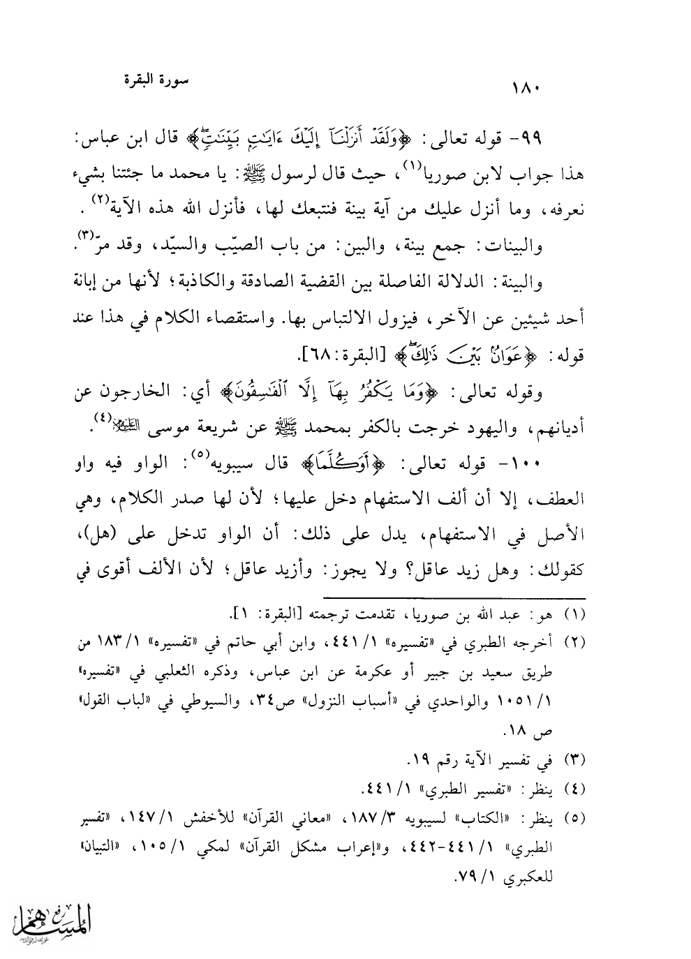 (¬5) ينظر: "الكتاب" لسيبويه 3/ 187، "معاني القرآن" للأخفش 1/ 147، "تفسير الطبري" 1/ 441 - 442، و"إعراب مشكل القرآن" لمكي 1/ 105، "التبيان" للعكبري 1/ 79.