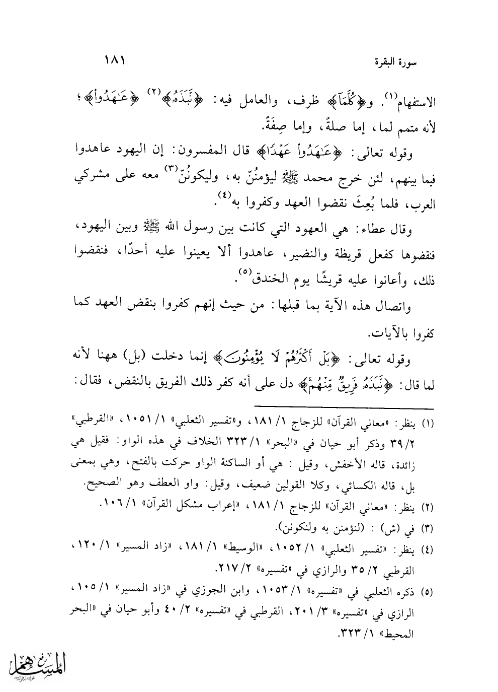 الاستفهام (¬1). و {كُلَّمَا} ظرف، والعامل فيه: {نَبَذَهُ} (¬2) {عَاهَدُوا}، لأنه متمم لما، إما صلةً، وإما صِفَةً.