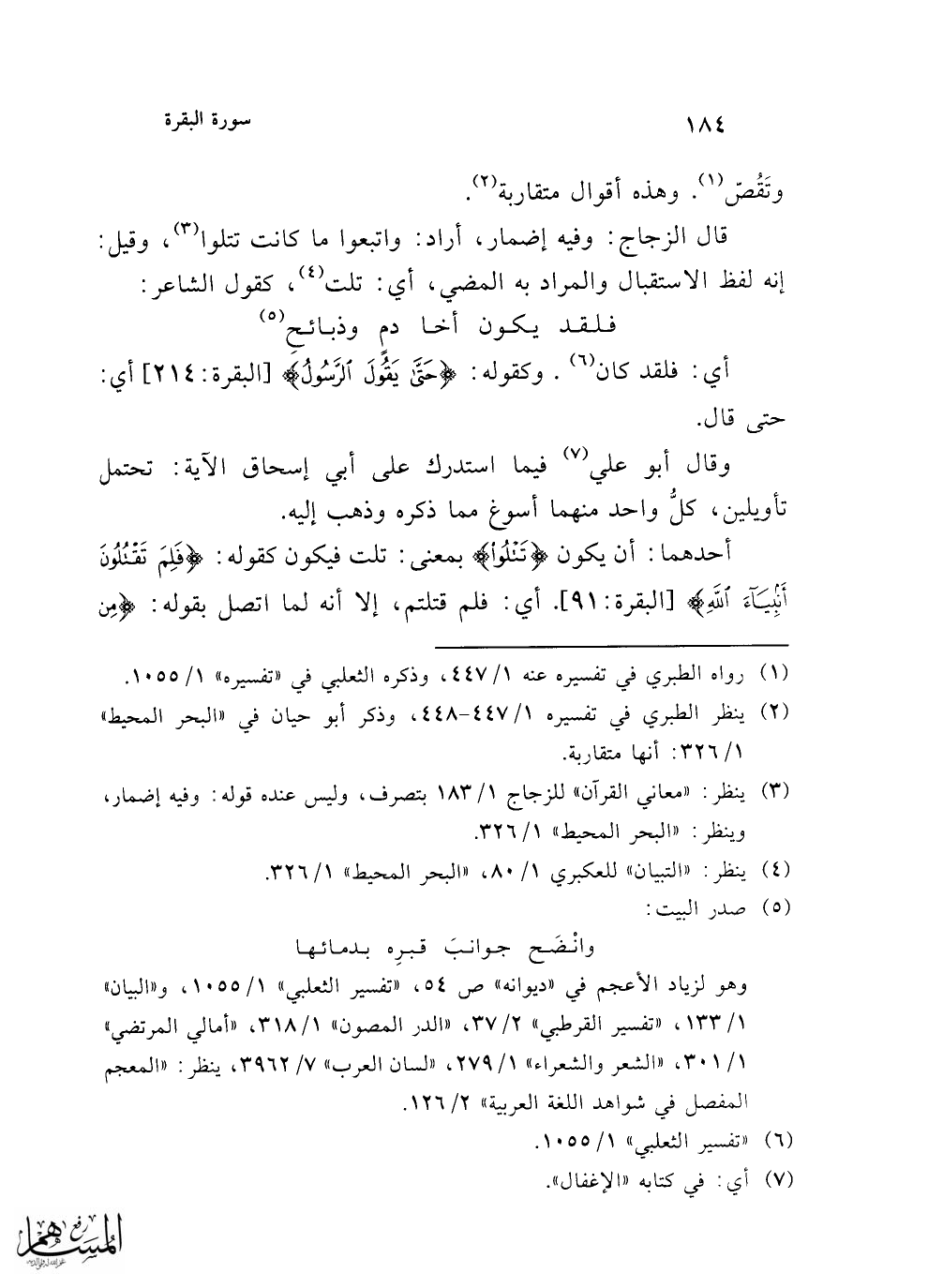 (¬2) ينظر الطبري في تفسيره 1/ 447 - 448، وذكر أبو حيان في "البحر المحيط" 1/ 326: أنها متقاربة.