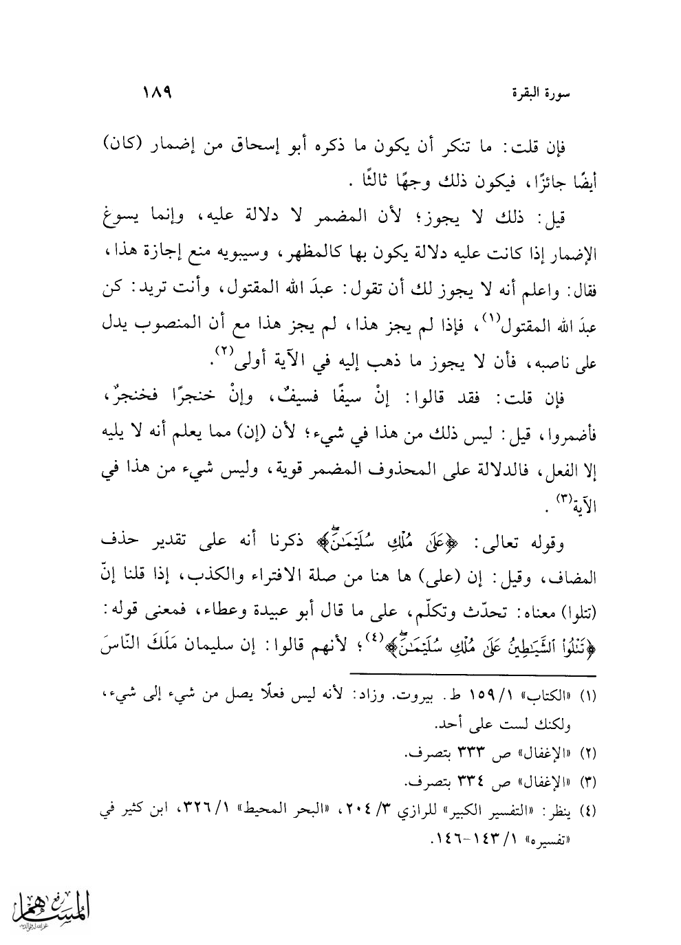 قيل: ذلك لا يجوز؛ لأن المضمر لا دلالة عليه، وإنما يسوغ الإضمار إذا كانت عليه دلالة يكون بها كالمظهر، وسيبويه منع إجازة هذا، فقال: واعلم أنه لا يجوز لك أن تقول: عبدَ الله المقتول، وأنت تريد: كن عبدَ الله المقتول (¬1)، فإذا لم يجز هذا، لم يجز هذا مع أن المنصوب يدل على ناصبه، فأن لا يجوز ما ذهب إليه في الآية أولى (¬2).