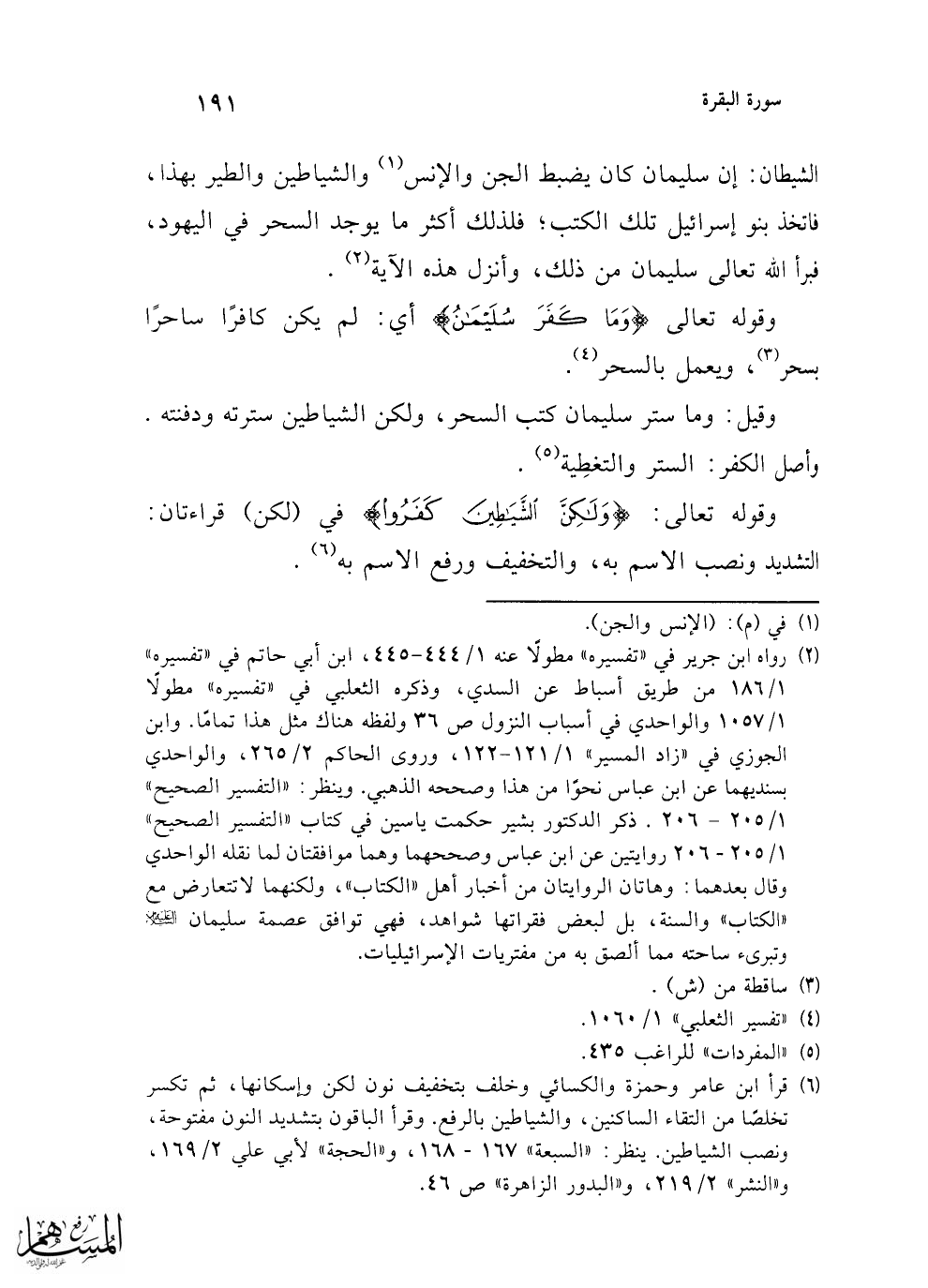 وقوله تعالى: {وَلَكِنَّ الشَّيَاطِينَ كَفَرُوا} في (لكن) قراءتان: التشديد ونصب الاسم به، والتخفيف ورفع الاسم به (¬6).