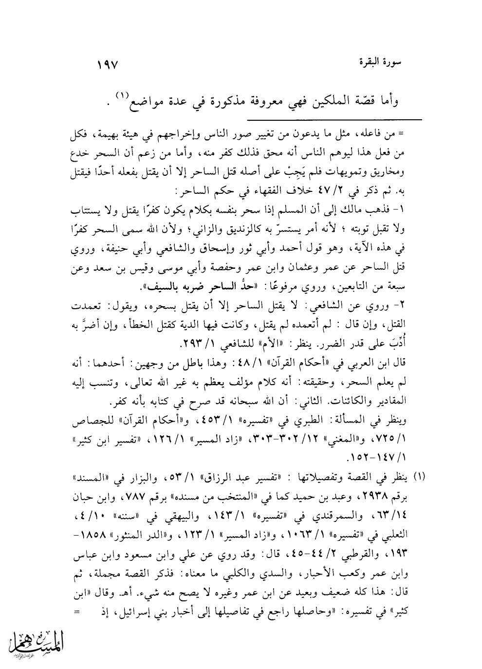 قال ابن العربي في "أحكام القرآن" 1/ 48: وهذا باطل من وجهين: أحدهما: أنه لم يعلم السحر، وحقيقته: أنه كلام مؤلف يعظم به غير الله تعالى، وتنسب إليه المقادير والكائنات. الثاني: أن الله سبحانه قد صرح في كتابه بأنه كفر.