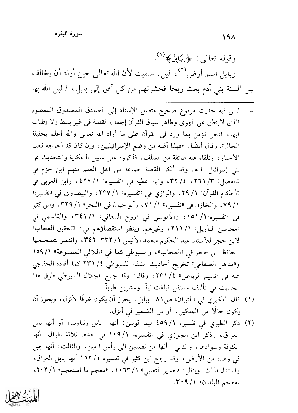 (¬2) ذكر الطبري فى تفسيره 1/ 459 فيها قولين: أنها: بابل رنباوند، أو أنها بابل العراق، وذكر ابن الجوزي في "تفسيره" 1/ 109 في حدها ثلاثة أقوال: أنها الكوفة وسوادها، والثاني: أنها من نصيبين إلى رأس العين، والثالث: أنها جبل في وهدة من الأرض، وقد رجح ابن كثير في تفسيره 1/ 152 أنها بابل العراق، واستدل لذلك. وينظر: "تفسير الثعلبي" 1/ 1063، "معجم ما استعجم" 1/ 202، "معجم البلدان" 1/ 309.