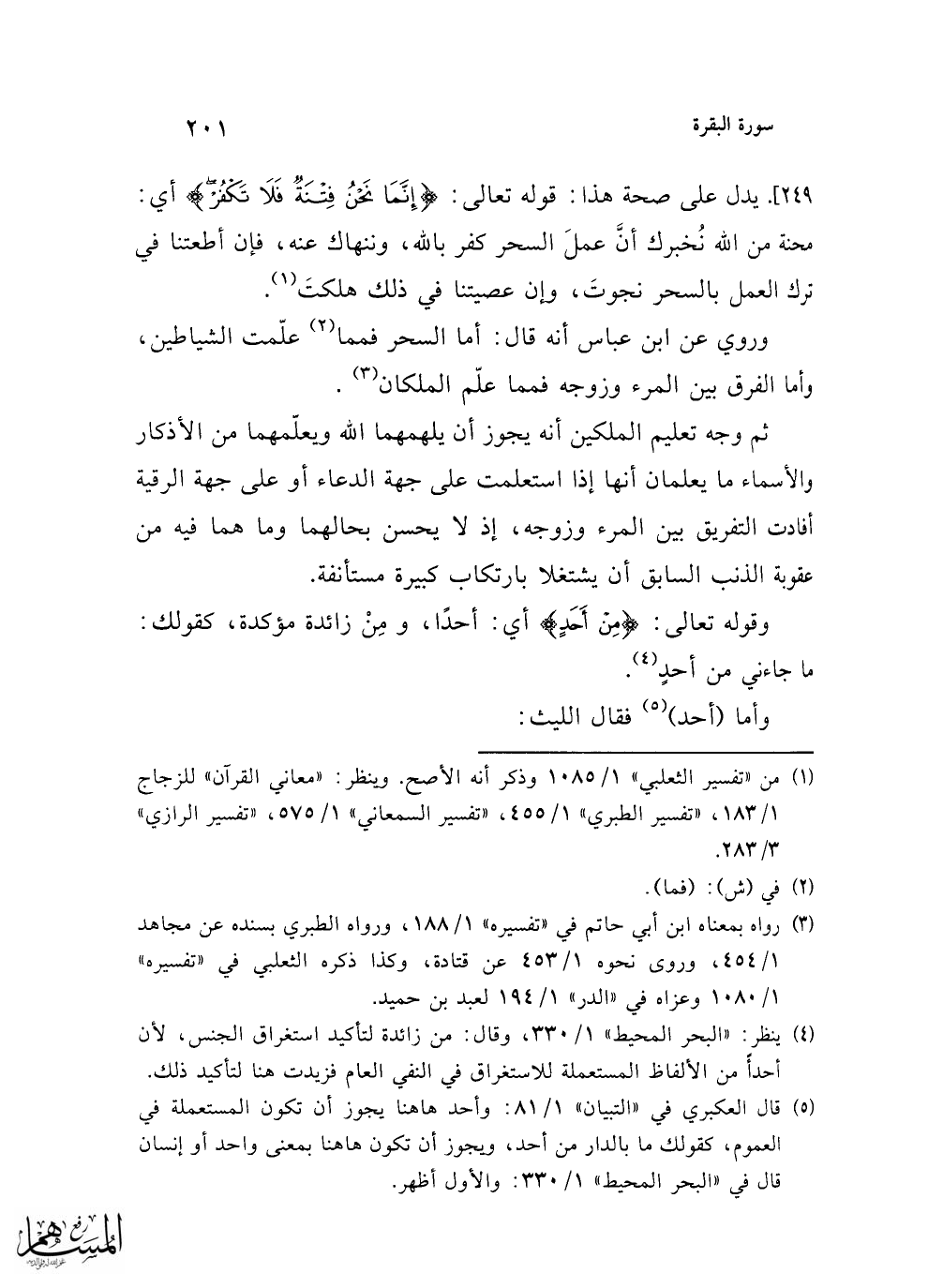 249]. يدل على صحة هذا: قوله تعالى: {إِنَّمَا نَحْنُ فِتْنَةٌ فَلَا تَكْفُرْ} أي: محنة من الله نُخبرك أنَّ عملَ السحر كفر بالله، وننهاك عنه، فإن أطعتنا في ترك العمل بالسحر نجوتَ، وإن عصيتنا في ذلك هلكتَ (¬1).