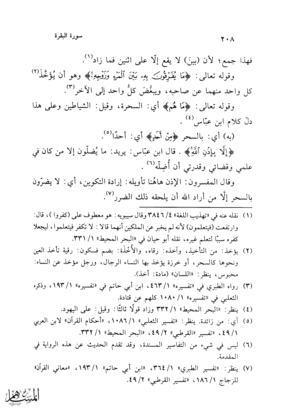 (¬1) نقله عنه في "تهذيب اللغة" 4/ 3846 وقال سيبويه: هو معطوف على (كفروا)، قال: وارتفعت (فيتعلمون) لأنه لم يخبر عن الملكين أنهما قالا: لا تكفر فيتعلموا، ليجعلا كفره سببا لتعلم غيره، نقله أبو حيان في "البحر المحيط" 1/ 331.