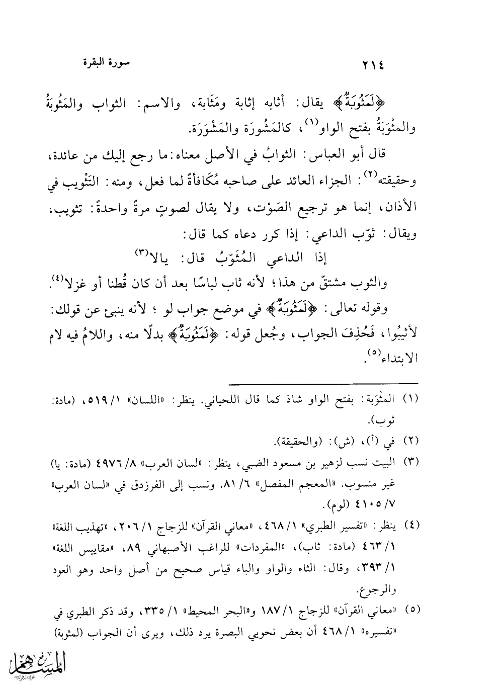 (¬4) ينظر: "تفسير الطبري" 1/ 468، "معاني القرآن" للزجاج 1/ 206، "تهذيب اللغة" 1/ 463 (مادة- ثاب)، "المفردات" للراغب الأصبهانى 89، "مقاييس اللغة" 1/ 393، وقال: الثاء والواو والباء قياس صحيح من أصل واحد وهو العود والرجوع.