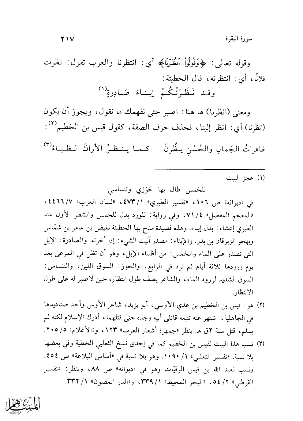 (¬3) نسب هذا البيت لقيس بن الخطيم كما في إحدى نسخ الثعلبي الخطية وفي بعضها بلا نسبة. "تفسير الثعلبي" 1/ 1090. وهو بلا نسبة في "أساس البلاغة" ص 454. ونسب لعبد الله بن قيس الرقيّات وهو في "ديوانه" ص 88، وينظر: "تفسير القرطبي" 2/ 54، "البحر المحيط" 1/ 339، و"الدر المصون" 1/ 332.