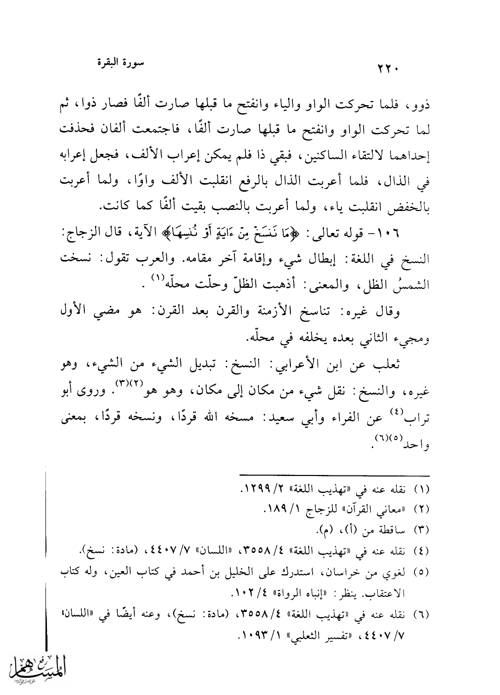 (¬5) نقله عنه في "تهذيب اللغة" 4/ 3558، (مادة: نسخ)، وعنه أيضًا في "اللسان" 7/ 4407، "تفسيرالثعلبي" 1/ 1093.