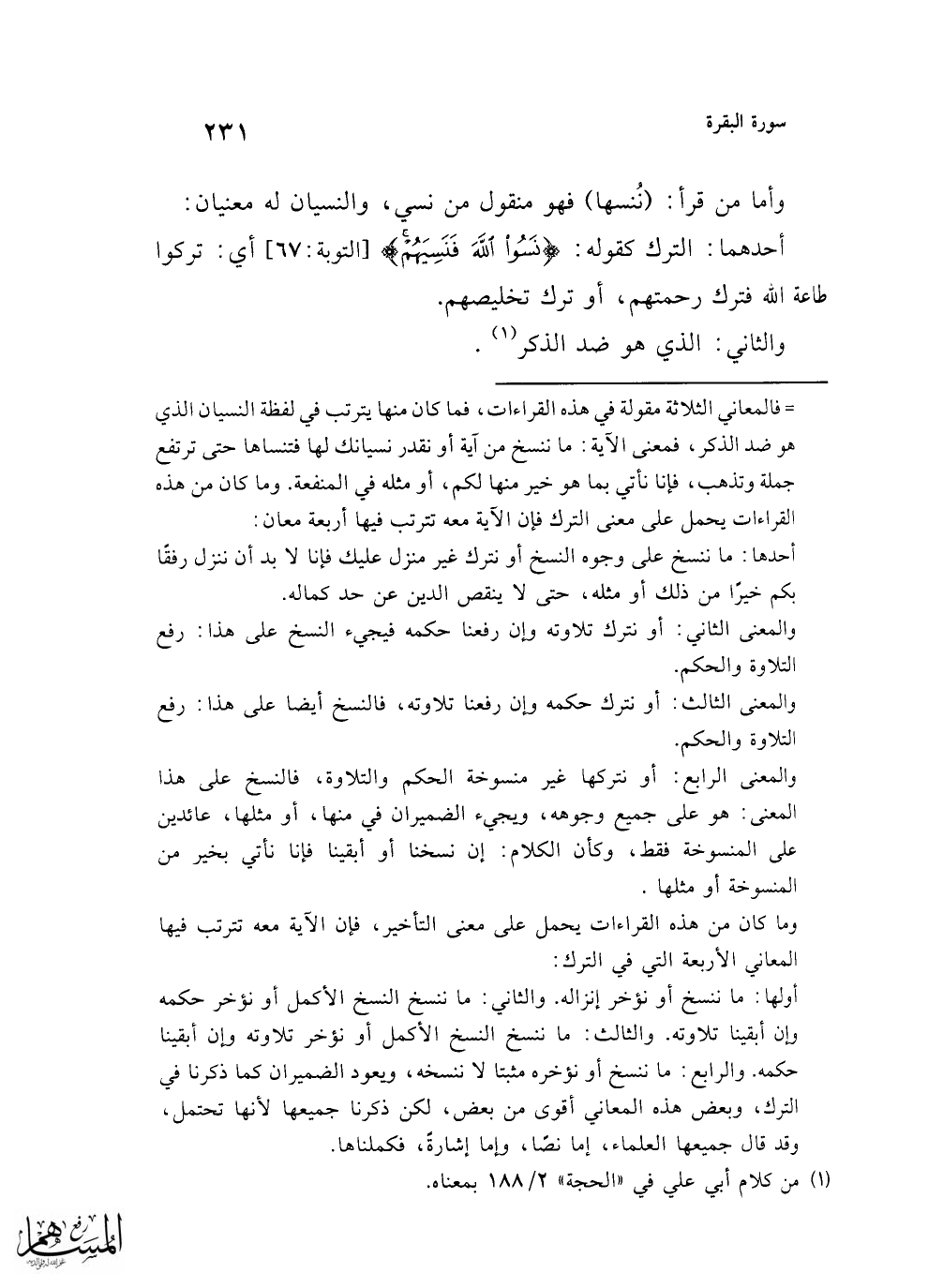 = فالمعاني الثلاثة مقولة في هذه القراءات، فما كان منها يترتب في لفظة النسيان الذي هو ضد الذكر، فمعنى الآية: ما ننسخ من آية أو نقدر نسيانك لها فتنساها حتى ترتفع جملة وتذهب، فإنا نأتي بما هو خير منها لكم، أو مثله في المنفعة. وما كان من هذه القراءات يحمل على معنى الترك فإن الآية معه تترتب فيها أربعة معان: