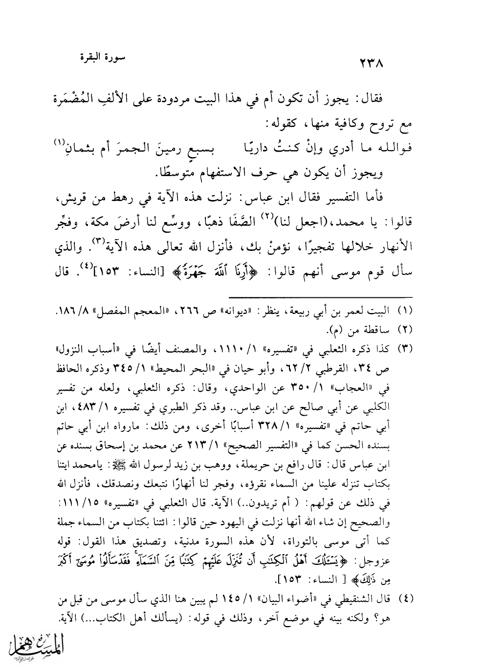 (¬4) قال الشنقيطي في "أضواء البيان" 1/ 145 لم يبين هنا الذي سأل موسى من قبل من هو؟ ولكنه بينه في موضع آخر، وذلك في قوله: (يسألك أهل الكتاب ...) الآية.