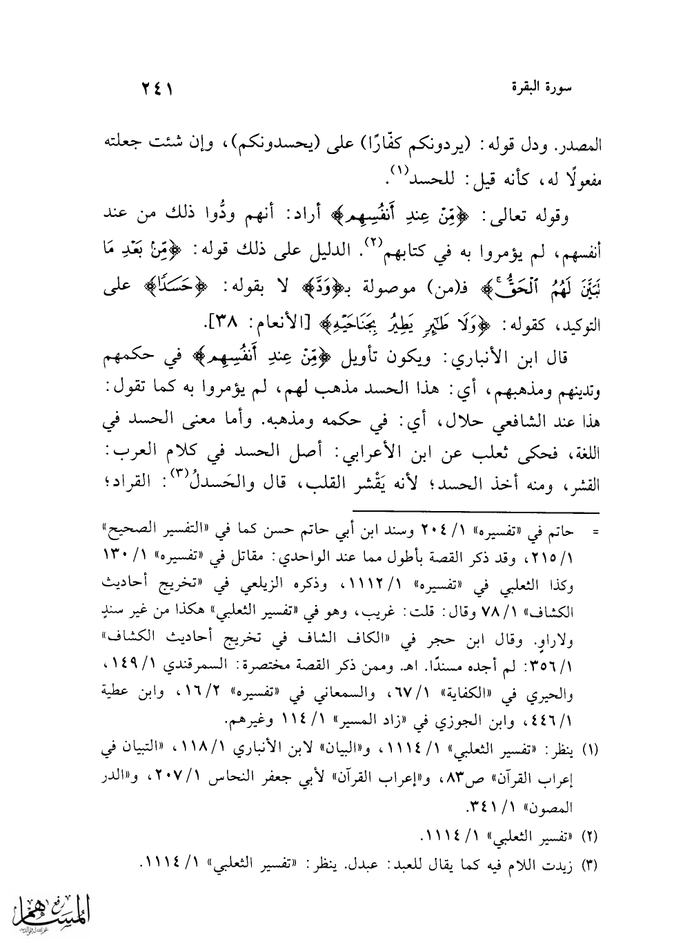 قال ابن الأنباري: ويكون تأويل {مِنْ عِنْدِ أَنْفُسِهِمْ} في حكمهم وتدينهم ومذهبهم، أي: هذا الحسد مذهب لهم، لم يؤمروا به كما تقول: هذا عند الشافعي حلال، أي: في حكمه ومذهبه. وأما معنى الحسد في اللغة، فحكى ثعلب عن ابن الأعرابي: أصل الحسد في كلام العرب: القشر، ومنه أخذ الحسد؛ لأنه يَقْشر القلب، قال والحَسدلُ (¬3): القرادة,