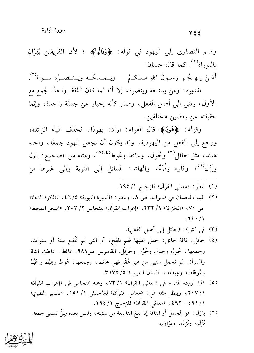 (¬5) كذا أورده الفراء في "معاني القرآن" 1/ 73، وعنه النحاس في "إعراب القرآن" 1/ 207، وينظر مثله في: "معاني القرآن" للأخفش 1/ 151، "تفسير الطبري" 1/ 491 - 492، "معاني القرآن" للزجاج 1/ 194.
