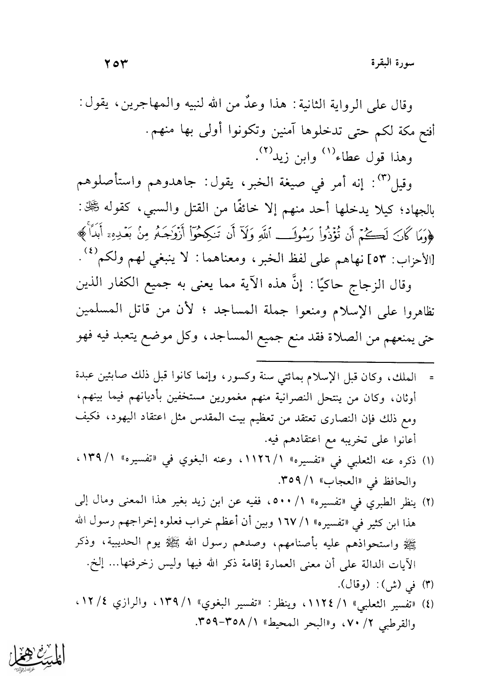 (¬2) ينظر الطبري في "تفسيره" 1/ 500، ففيه عن ابن زيد بغير هذا المعنى ومال إلى هذا ابن كثير في "تفسيره" 1/ 167 وبين أن أعظم خراب فعلوه إخراجهم رسول الله - صلى الله عليه وسلم - واستحواذهم عليه بأصنامهم، وصدهم رسول الله - صلى الله عليه وسلم - يوم الحديبية، وذكر الآيات الدالة على أن معنى العمارة إقامة ذكر الله فيها وليس زخرفتها ... إلخ.