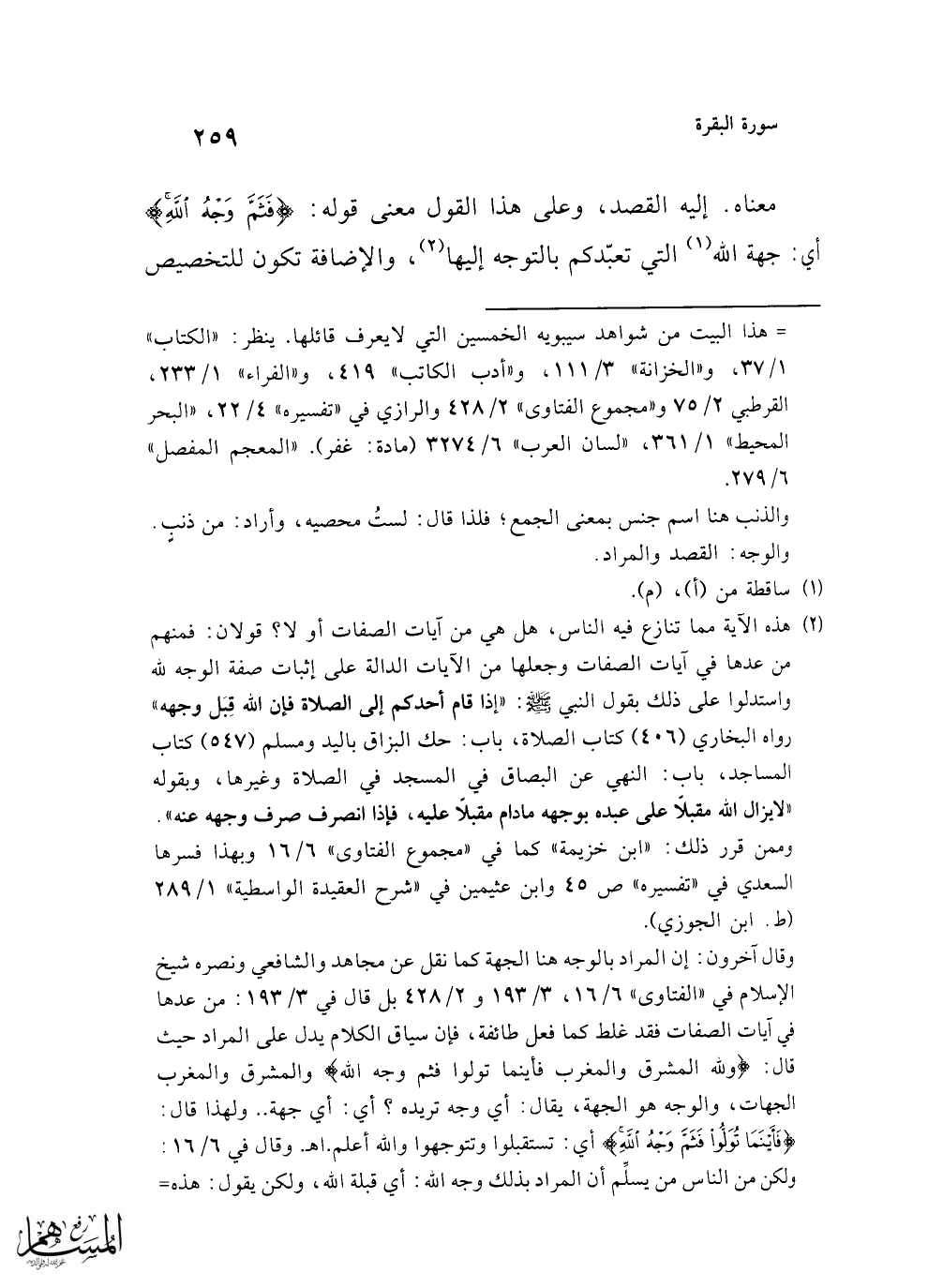 وقال آخرون: إن المراد بالوجه هنا الجهة كما نقل عن مجاهد والشافعي ونصره شيخ الإسلام في "الفتاوى" 6/ 16، 3/ 193و 2/ 428 بل قال في 3/ 193: من عدها في آيات الصفات فقد غلط كما فعل طائفة، فإن سياق الكلام يدل على المراد حيث قال: {وَلِلَّهِ الْمَشْرِقُ وَالْمَغْرِبُ فَأَيْنَمَا تُوَلُّوا فَثَمَّ وَجْهُ اللَّهِ} والمشرق والمغرب الجهات، والوجه هو الجهة، يقال: أي وجه تريده؟ أي: أي جهة .. ولهذا قال: {فَأَيْنَمَا تُوَلُّوا فَثَمَّ وَجْهُ اللَّهِ} أي: تستقبلوا وتتوجهوا والله أعلم. اهـ. وقال في 6/ 16: ولكن من الناس من يسلِّم أن المراد بذلك وجه الله: أي قبلة الله، ولكن يقول: هذه =