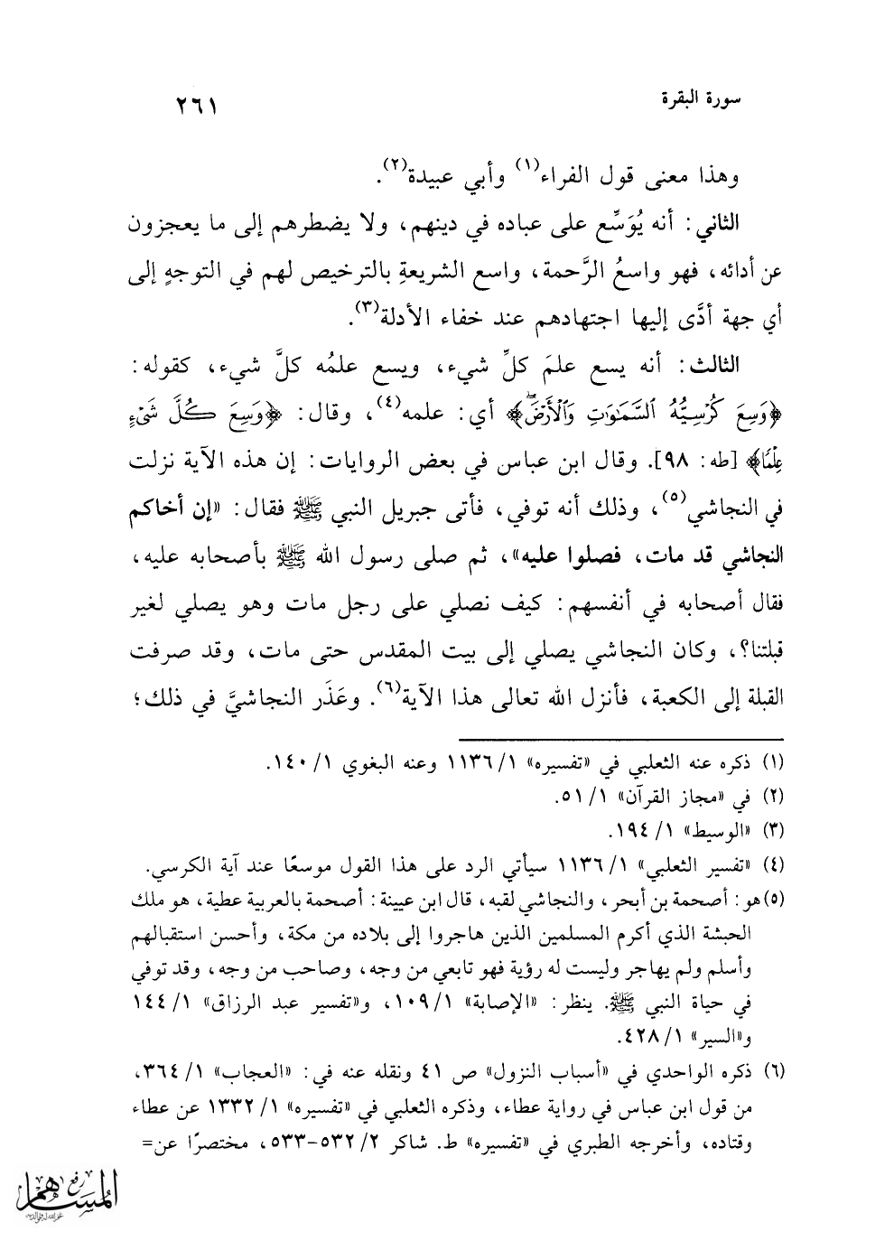 الثالث: أنه يسع علمَ كلِّ شيء، ويسع علمُه كلَّ شيء، كقوله: {وَسِعَ كُرْسِيُّهُ السَّمَاوَاتِ وَالْأَرْضَ} أي: علمه (¬4)، وقال: {وَسِعَ كُلَّ شَيْءٍ عِلْمًا} [طه: 98]. وقال ابن عباس في بعض الروايات: إن هذه الآية نزلت في النجاشي (¬5)، وذلك أنه توفي، فأتى جبريل النبي - صلى الله عليه وسلم - فقال: "إن أخاكم النجاشي قد مات، فصلوا عليه"، ثم صلى رسول الله - صلى الله عليه وسلم - بأصحابه عليه، فقال أصحابه في أنفسهم: كيف نصلي على رجل مات وهو يصلي لغير قبلتنا؟، وكان النجاشي يصلي إلى بيت المقدس حتى مات، وقد صرفت القبلة إلى الكعبة، فأنزل الله تعالى هذا الآية (¬6). وعَذَر النجاشيَّ في ذلك؛