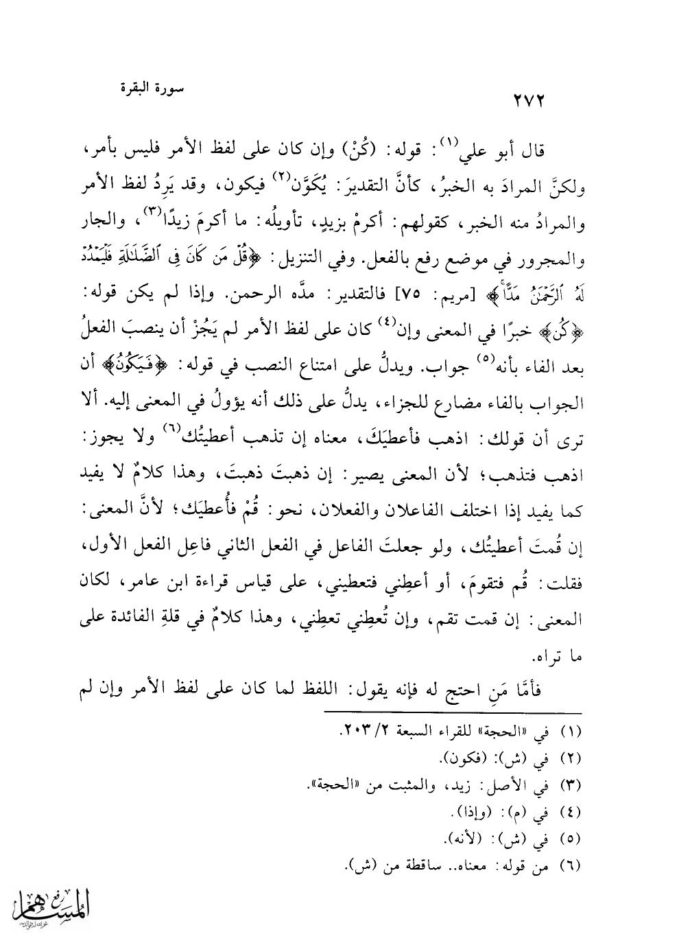 قال أبو علي (¬1): قوله: (كُنْ) وإن كان على لفظ الأمر فليس بأمر، ولكنَّ المرادَ به الخبرُ، كأنَّ التقديرَ: يُكَوَّن (¬2) فيكون، وقد يَرِدُ لفظ الأمر والمرادُ منه الخبر، كقولهم: أكرمْ بزيدٍ، تأويلُه: ما أكرمَ زيدًا (¬3)، والجار والمجرور في موضع رفع بالفعل. وفي التنزيل: {قُلْ مَنْ كَانَ فِي الضَّلَالَةِ فَلْيَمْدُدْ لَهُ الرَّحْمَنُ مَدًّا} [مريم: 75] فالتقدير: مدَّه الرحمن. وإذا لم يكن قوله: {كُنْ} خبرًا في المعنى وإن (¬4) كان على لفظ الأمر لم يَجُزْ أن ينصبَ الفعلُ بعد الفاء بأنه (¬5) جواب. ويدل على امتناع النصب في قوله: {فَيَكوُنُ} أن الجواب بالفاء مضارع للجزاء، يدلُّ على ذلك أنه يؤولُ في المعنى إليه. ألا ترى أن قولك: اذهب فأعطيَكَ، معناه إن تذهب أعطيتُك (¬6) ولا يجوز: اذهب فتذهب؛ لأن المعنى يصير: إن ذهبتَ ذهبتَ، وهذا كلامٌ لا يفيد كما يفيد إذا اختلف الفاعلان والفعلان، نحو: قُمْ فأُعطيَك؛ لأنَّ المعنى: إن قُمتَ أعطيتُك، ولو جعلتَ الفاعل في الفعل الثاني فاعِل الفعل الأول، فقلت: قُم فتقومَ، أو أعطِني فتعطيني، على قياس قراءة ابن عامر، لكان المعنى: إن قمت تقم، وإن تُعطِني تعطِني، وهذا كلامٌ في قلةِ الفائدة على ما تراه.