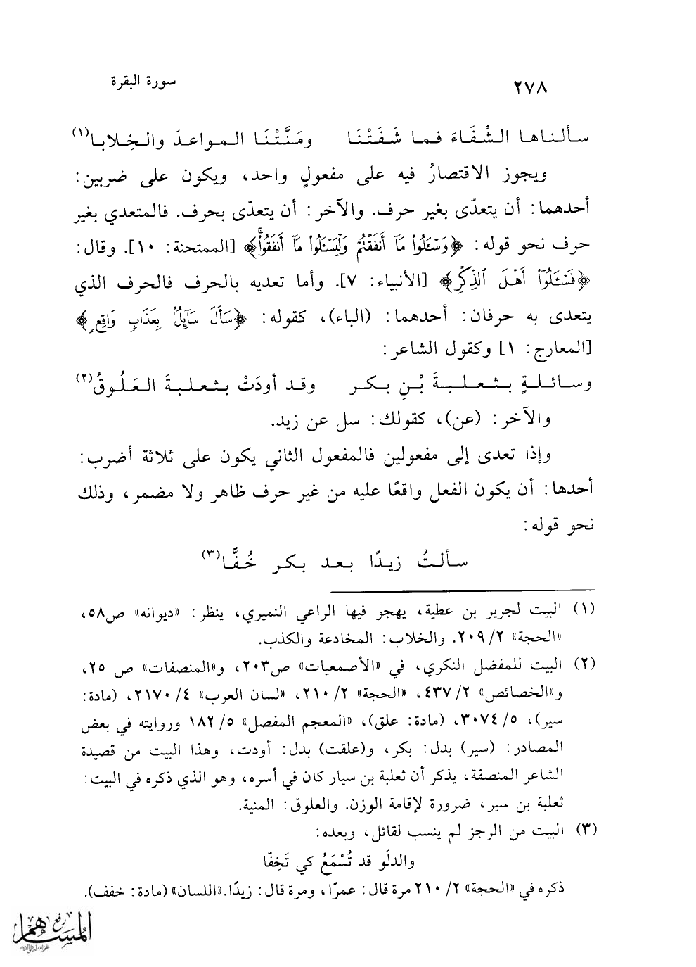 ويجوز الاقتصارُ فيه على مفعولٍ واحد، ويكون على ضربين: أحدهما: أن يتعدّى بغير حرف. والآخر: أن يتعدّى بحرف. فالمتعدي بغير حرف نحو قوله: {وَاسْأَلُوا مَا أَنْفَقْتُمْ وَلْيَسْأَلُوا مَا أَنْفَقُوا} [الممتحنة: 10]. وقال: {فَاسْأَلُوا أَهْلَ الذِّكْرِ} [الأنبياء: 7]. وأما تعديه بالحرف فالحرف الذي يتعدى به حرفان. أحدهما: (الباء)، كقوله: {سَأَلَ سَائِلٌ بِعَذَابٍ وَاقِعٍ} [المعارج: 1]، وكقول الشاعر: