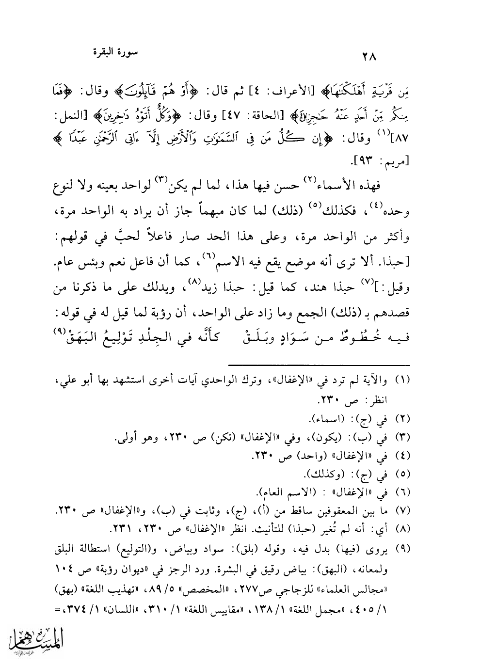(¬7) ما بين المعقوفين ساقط من (أ)، (ج)، وثابت في (ب)، و"الإغفال" ص 230.