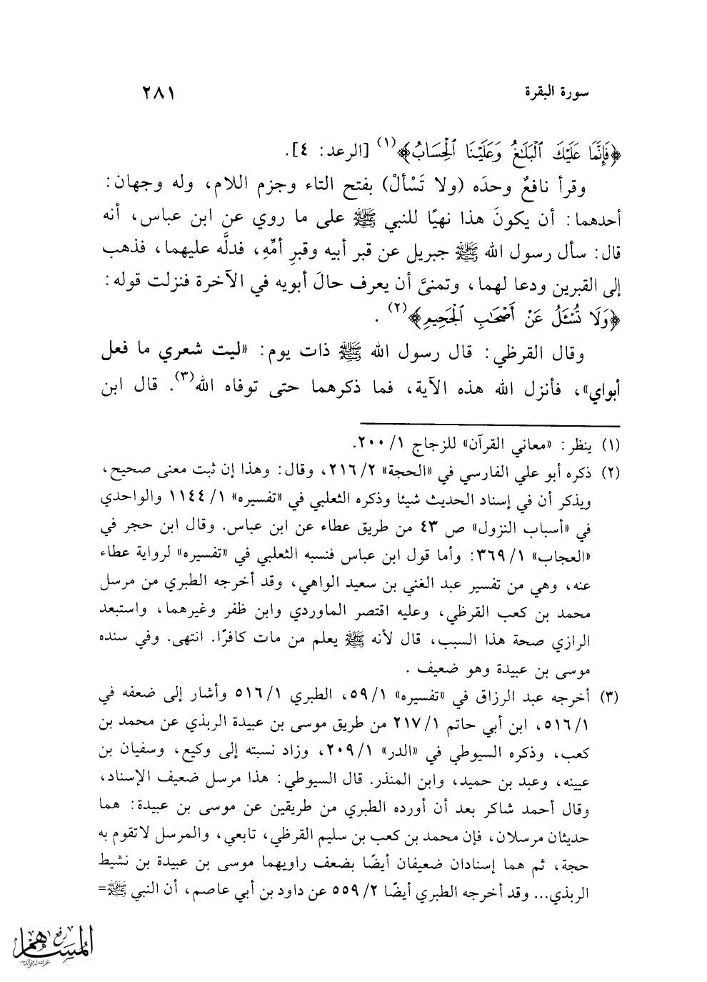 (¬3) أخرجه عبد الرزاق في "تفسيره" 1/ 59، الطبري 1/ 516 وأشار إلى ضعفه في 1/ 516، ابن أبي حاتم 1/ 217 من طريق موسى بن عبيدة الربذي عن محمد بن كعب، وذكره السيوطي في "الدر" 1/ 209، وزاد نسبته إلى وكيع، وسفيان بن عيينه، وعبد بن حميد، وابن المنذر. قال السيوطي: هذا مرسل ضعيف الإسناد، وقال أحمد شاكر بعد أن أورده الطبري من طريقين عن موسى بن عبيدة: هما حديثان مرسلان، فإن محمد بن كعب بن سليم القرظي، تابعي، والمرسل لا تقوم به حجة، ثم هما إسنادان ضعيفان أيضًا بضعف راويهما موسى بن عبيدة بن نشيط الربذي ... وقد أخرجه الطبري أيضًا 2/ 559 عن داود بن أبي عاصم، أن النبي -صلى الله عليه وسلم- =