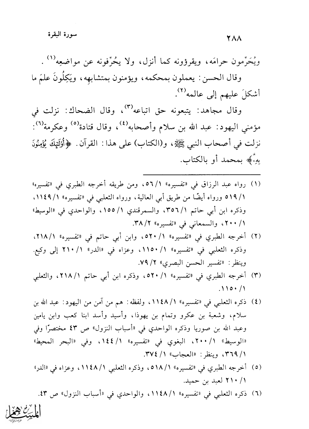 وقال مجاهد: يتبعونه حق اتباعه (¬3)، وقال الضحاك: نزلت في مؤمني اليهود: عبد الله بن سلام وأصحابه (¬4)، وقال قتادة (¬5) وعكرمة (¬6): نزلت في أصحاب النبي - صلى الله عليه وسلم -، و (الكتاب) على هذا: القرآن. {أُولَئِكَ يُؤْمِنُونَ بِهِ} بمحمد أو بالكتاب.