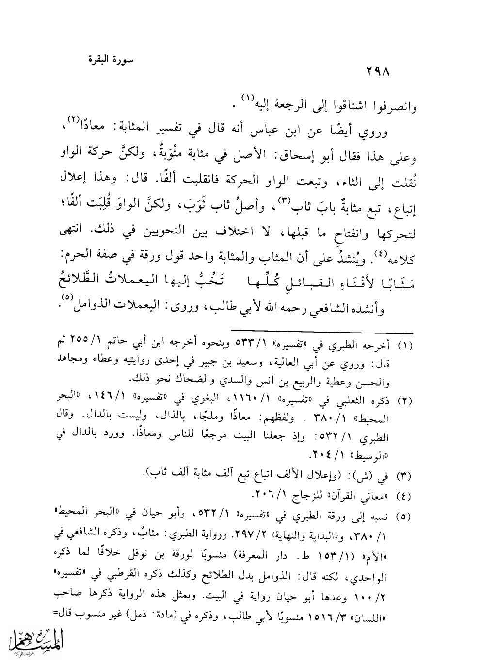 (¬2) ذكره الثعلبي في "تفسيره" 1/ 1160، البغوي في "تفسيره" 1/ 146، "البحر المحيط" 1/ 380. ولفظهم: معاذًا وملجًا، بالذال، وليست بالدال. وقال الطبري 1/ 532: وإذ جعلنا البيت مرجعا للناس ومعاذًا. وورد بالدال في "الوسيط" 1/ 204.