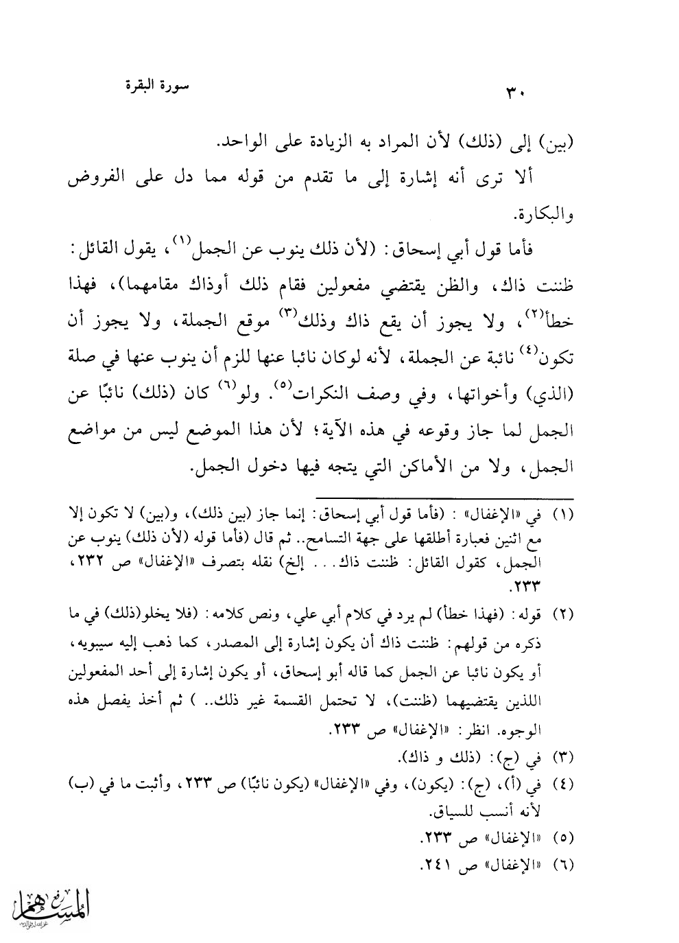 (¬1) في "الإغفال": (فأما قول أبي إسحاق: إنما جاز (بين ذلك)، و (بين) لا تكون إلا مع اثنين فعبارة أطلقها على جهة التسامح .. ثم قال (فاما قوله (لأن ذلك) ينوب عن الجمل، كقول القائل: ظننت ذاك ... إلخ) نقله بتصرف "الإغفال" ص 232، 233.