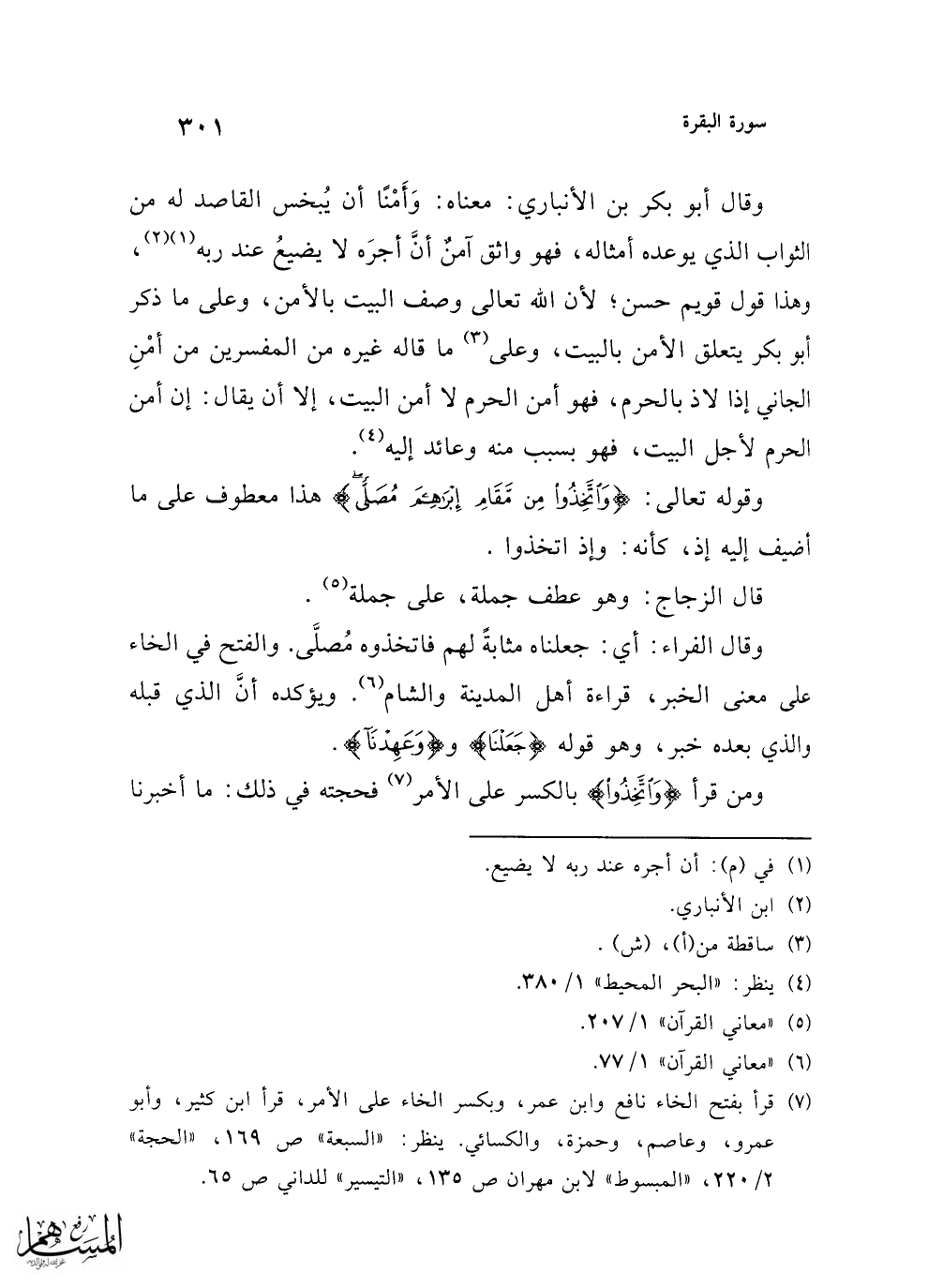 وقال الفراء: أي: جعلناه مثابةً لهم فاتخذوه مُصلَّى. والفتح في الخاء على معنى الخبر، قراءة أهل المدينة والشام (¬6). ويؤكده أنَّ الذي قبله والذي بعده خبر، وهو قوله {جَعَلْنَا} و {وَعَهِدْنَا}.
