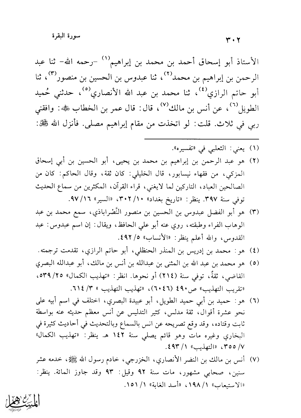 الأستاذ أبو إسحاق أحمد بن محمد بن إبراهيم (¬1) -رحمه الله- ثنا عبد الرحمن بن إبراهيم بن محمد (¬2)، ثنا عبدوس بن الحسين بن منصور (¬3)، ثنا أبو حاتم الرازي (¬4)، ثنا محمد بن عبد الله الأنصاري (¬5)، حدثني حُميد الطويل (¬6)، عن أنس بن مالك (¬7)، قال: قال عمر بن الخطاب -رضي الله عنه-: وافقني ربي في ثلاث. قلت: لو اتخذت من مقام إبراهيم مصلى. فأنزل الله عز وجل: