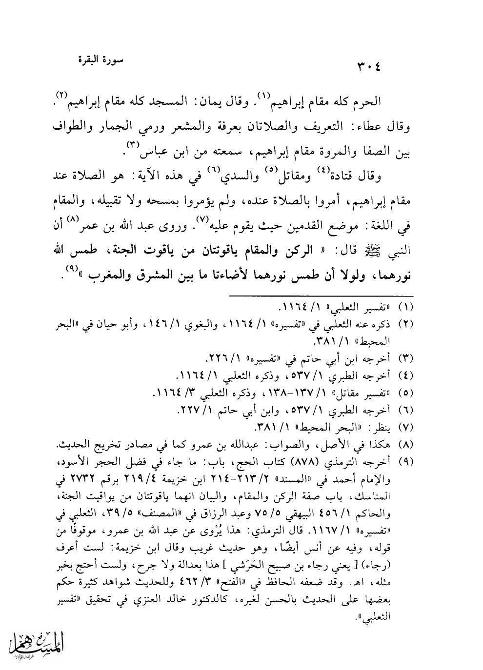 (¬9) أخرجه الترمذي (878) كتاب الحج، باب: ما جاء في فضل الحجر الأسود، والإمام أحمد في "المسند" 2/ 213 - 214 ابن خزيمة 4/ 219 برقم 2732 في المناسك، باب صفة الركن والمقام، والبيان انهما ياقوتتان من يواقيت الجنة، والحاكم 1/ 456 البيهقي 5/ 75 وعبد الرزاق في "المصنف" 5/ 39، الثعلبي في "تفسيره" 1/ 1167. قال الترمذي: هذا يُرْوى عن عبد الله بن عمرو، موقوفًا من قوله، وفيه عن أنس أيضا، وهو حديث غريب وقال ابن خزيمة: لست أعرف (رجاء) [يعني رجاء بن صبيح الحَرَشي] هذا بعدالة ولا جرح، ولست أحتج بخبر مثله، اهـ. وقد ضعفه الحافظ في "الفتح" 3/ 462 وللحديث شواهد كثيرة حكم بعضها على الحديث بالحسن لغيره، كالدكتور خالد العنزي في تحقيق "تفسير الثعلبي".