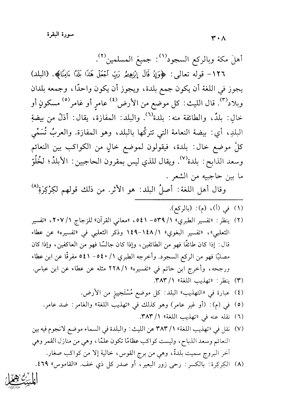 126 - قوله تعالى: {وَإِذْ قَالَ إِبْرَاهِيمُ رَبِّ اجْعَلْ هَذَا بَلَدًا آمِنًا}. (البلد) يجوز في اللغة أن يكون جمع بلدة، ويجوز أن يكون واحدًا، وجمعه بلدان وبلاد (¬3). قال الليث: كل موضع من الأرض (¬4) عامرٍ أو غامر (¬5) مسكونٍ أو خالٍ: بلدٌ، والطائفة منه: بلدة (¬6). والبلد: المفازة، يقال: أذلّ من بيضةِ البلدِ، أي: بيضة النعامة التي تتركُها بالبلد، وهو المفازة. والعربُ تُسَمِّي كلَّ موضع خال: بلدة، فيقولون لموضع خالٍ من الكواكب بين النعائم وسعد الذابح: بلدة (¬7). ويقال للذي ليس بمقرون الحاجبين: الأبلدُ؛ لخُلُوّ ما بين حاجبيه من الشعر.