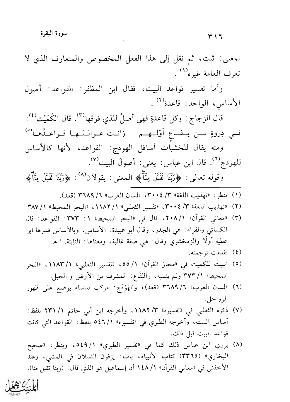 (¬8) يروي ابن عباس ذلك كما في "تفسير الطبري" 1/ 549، وينظر: "صحيح البخاري" (3365) كتاب الأنبياء، باب: يزفون النسلان في المشي، وعند الأخفش في "معاني القرآن" 1/ 148 أن إسماعيل هو الذي قال: (ربنا تقبل منا).