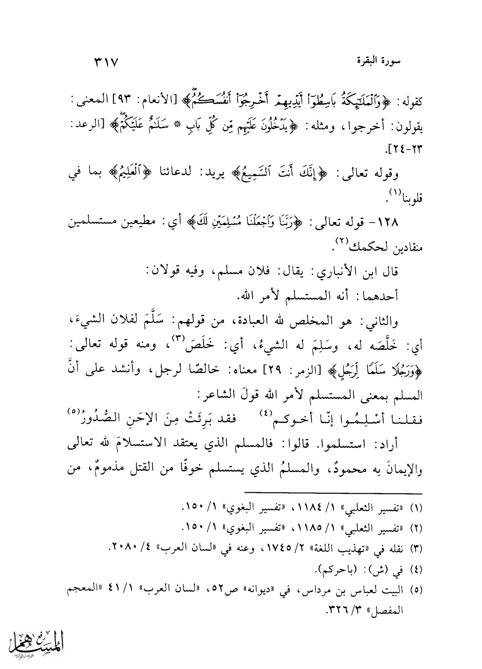 والثاني: هو المخلص لله العبادة، من قولهم: سَلَّمَ لفلان الشيءَ، أي: خَلَّصَه له، وسَلِمَ له الشيءُ، أي: خَلَصَ (¬3)، ومنه قوله تعالى: {وَرَجُلًا سَلَمًا لِرَجُلٍ} [الزمر: 29]، معناه: خالصًا لرجل، وأنشد على أنَّ المسلم بمعنى المستسلم لأمر الله قولَ الشاعر:
