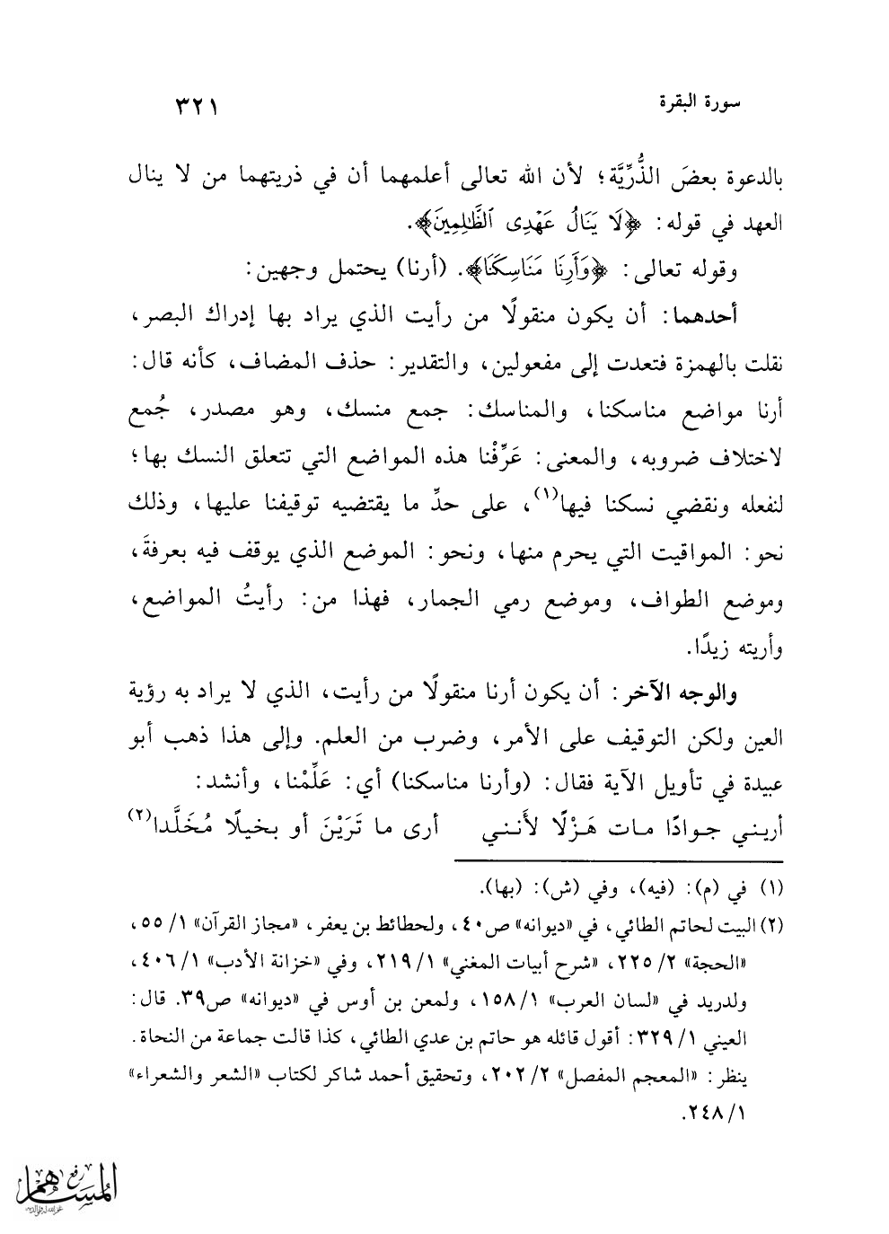 أحدهما: أن يكون منقولًا من رأيت الذي يراد بها إدراك البصر، نقلت بالهمزة فتعدت إلى مفعولين، والتقدير: حذف المضاف، كأنه قال: أرنا مواضع مناسكنا، والمناسك: جمع منسك، وهو مصدر، جُمع لاختلاف ضروبه، والمعنى: عَرِّفْنا هذه المواضع التي تتعلق النسك بها؛ لنفعله ونقضي نسكنا فيها (¬1)، على حدِّ ما يقتضيه توقيفنا عليها، وذلك نحو: المواقيت التي يحرم منها، ونحو: الموضع الذي يوقف فيه بعرفةَ، وموضع الطواف، وموضع رمي الجمار، فهذا من: رأيتُ المواضع، وأريته زيدًا.