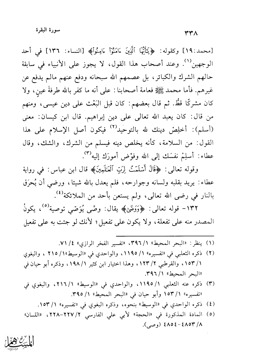 (¬1) ينظر: "البحر المحيط" 1/ 396، "تفسير الفخر الرازي" 4/ 71.