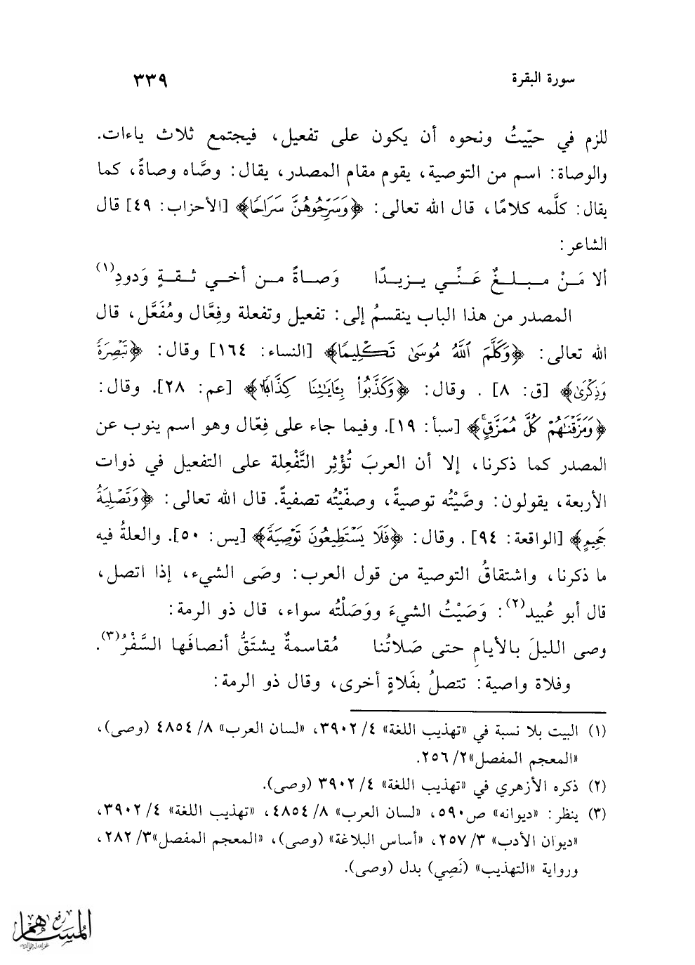 المصدر من هذا الباب ينقسمُ إلى: تفعيل وتفعلة وفِعَّال ومُفَعَّل، قال الله تعالى: {وَكَلَّمَ اللَّهُ مُوسَى تَكْلِيمًا} [النساء: 164] وقال: {تَبْصِرَةً وَذِكْرَى} [ق: 8]. وقال: {وَكَذَّبُوا بِآيَاتِنَا كِذَّابًا} [عم: 28]. وقال: {وَمَزَّقْنَاهُمْ كُلَّ مُمَزَّقٍ} [سبأ: 19]. وفيما جاء على فِعال وهو اسم ينوب عن المصدر كما ذكرنا، إلا أن العربَ تُؤْثِر التَّفْعِلة على التفعيل في ذوات الأربعة، يقولون: وصَّيْتُه توصيةً، وصفّيْتُه تصفيةً. قال الله تعالى: {وَتَصْلِيَةُ جَحِيمٍ} [الواقعة: 94]. وقال: {فَلَا يَسْتَطِيعُونَ تَوْصِيَةً} [يس: 50]. والعلةُ فيه ما ذكرنا، واشتقاقُ التوصية من قول العرب: وصَى الشيء، إذا اتصل، قال أبو عُبيد (¬2): وَصَيْتُ الشيءَ ووَصَلْتُه سواء، قال ذو الرمة: