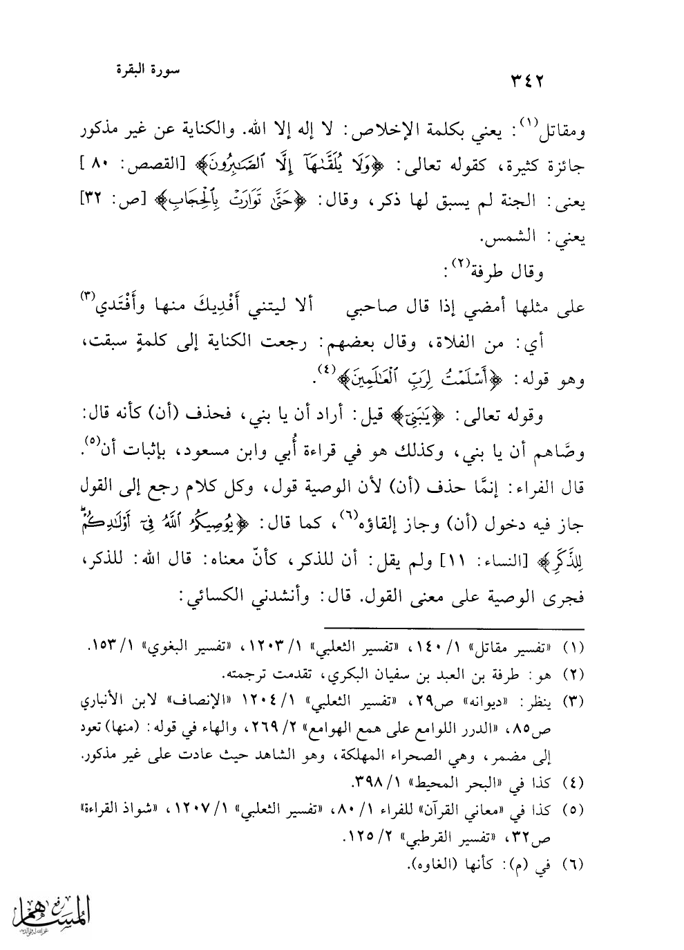 (¬1) "تفسير مقاتل" 1/ 140، "تفسير الثعلبي" 1/ 1203، "تفسير البغوي" 1/ 153.