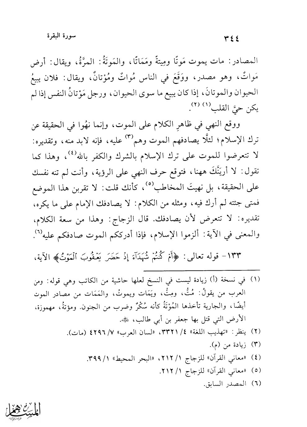 ووقع النهي في ظاهرِ الكلام على الموت، وإنما نهُوا في الحقيقة عن ترك الإسلام؛ لئلَّا يصادفهم الموت وهم (¬3) عليه، فإنه لابد منه، وتقديره: لا تتعرضوا للموت على ترك الإسلام بالشرك والكفر بالله (¬4)، وهذا كما تقول: لا أريَنَّكَ ههنا، فتوقع حرف النهي على الرؤية، وأنت لم تنه نفسك على الحقيقة، بل نهيتَ المخاطب (¬5)، كأنك قلت: لا تقربن هذا الموضع فمتى جئته لم أرك فيه، ومثله من الكلام: لا يصادفك الإمام على ما يكره، تقديره: لا تتعرض لأن يصادفك. قال الزجاج: وهذا من سعة الكلام، والمعنى في الآية: ألزموا الإسلام، فإذا أدرككم الموت صادفكم عليه (¬6).