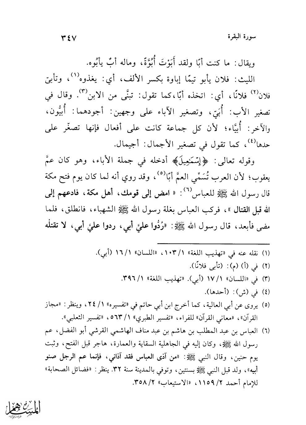 وقوله تعالى: {وَإِسْمَاعِيلَ} أدخله في جملة الأباء، وهو كان عمَّ يعقوب؛ لأن العرب تُسَمِّي العمَّ أبًا (¬5)، وقد روي أنه لما كان يوم فتح مكة قال رسول الله - صلى الله عليه وسلم - للعباس (¬6): "امض إلى قومك، أهل مكة، فادعهم إلى الله قبل القتال"، فركب العباس بغلة رسول الله - صلى الله عليه وسلم - الشهباء، فانطلق، فلما مضى فأبعد، قال رسول الله - صلى الله عليه وسلم -: "رُدُّوا عليَّ أبي، ردوا عليَّ أبي، لا تقتلْه