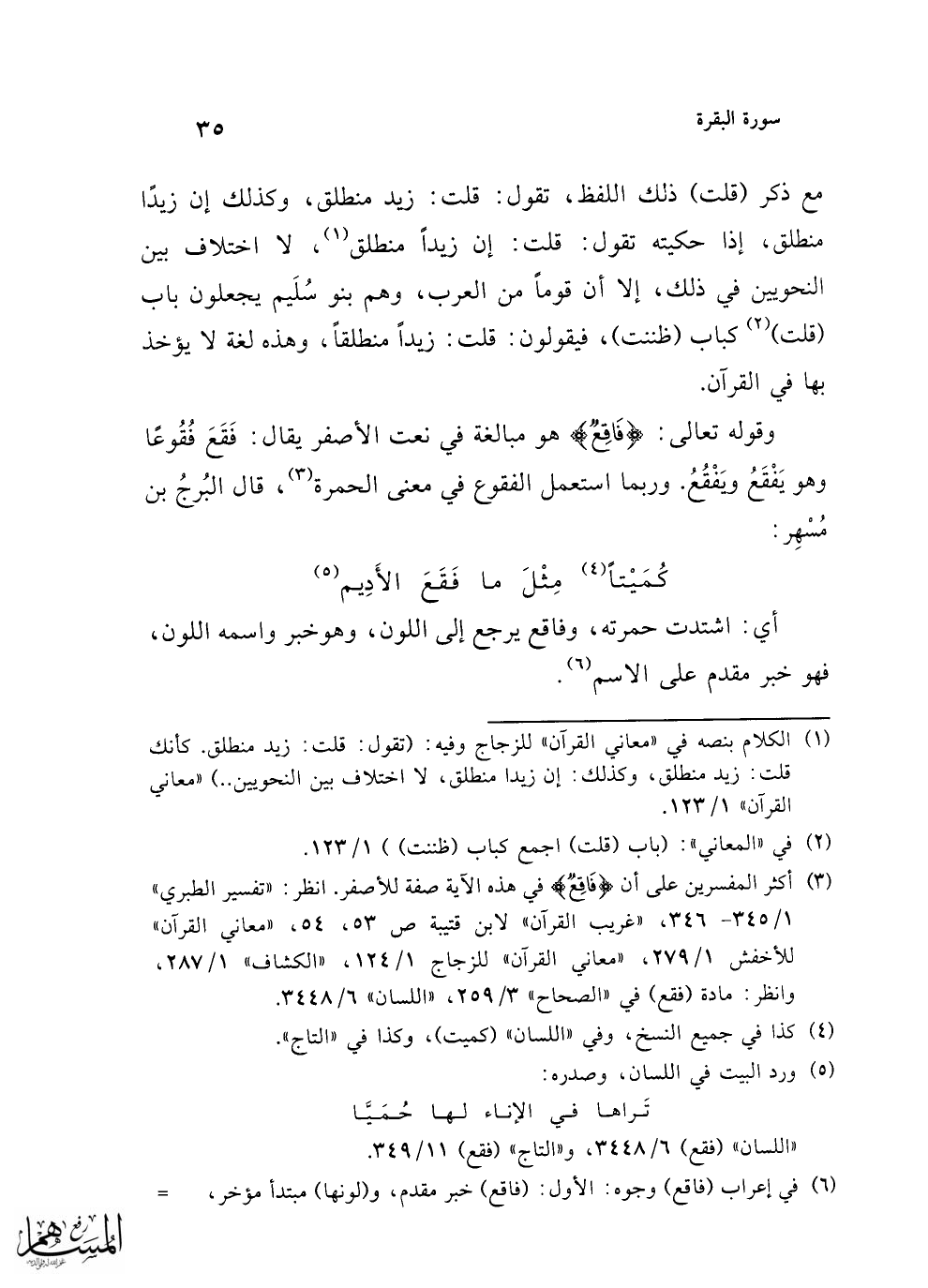 (¬3) أكثر المفسرين على أن {فَاقِعٌ} في هذه الآية صفة للأصفر. انظر: "تفسير الطبري" 1/ 345 - 346، "غريب القرآن" لابن قتيبة ص 53، 54، "معاني القرآن" للأخفش1/ 279، "معاني القرآن" للزجاج1/ 124، "الكشاف" 1/ 287، وانظر: مادة (فقع) في "الصحاح" 3/ 259، "اللسان" 6/ 3448.