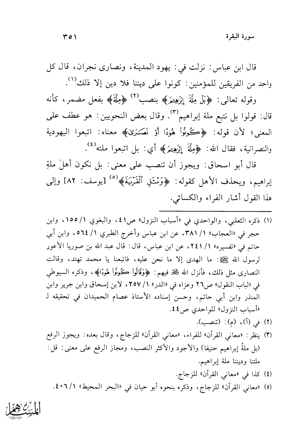 وقوله تعالى: {بَلْ مِلَّةَ إِبْرَاهِيمَ} بنصب (¬2) {مِلَّةَ} بفعل مضمر، كأنه قال: قولوا بل نتبع ملة إبراهيم (¬3). وقال بعض النحويين: هو عطف على المعنى؛ لأن قوله: {كُونُوا هُودًا أَوْ نَصَارَى} معناه: اتبعوا اليهودية والنصرانية، فقال الله: {مِلَّةَ إِبْرَاهِيمَ} أي: بل اتبعوا ملته (¬4).