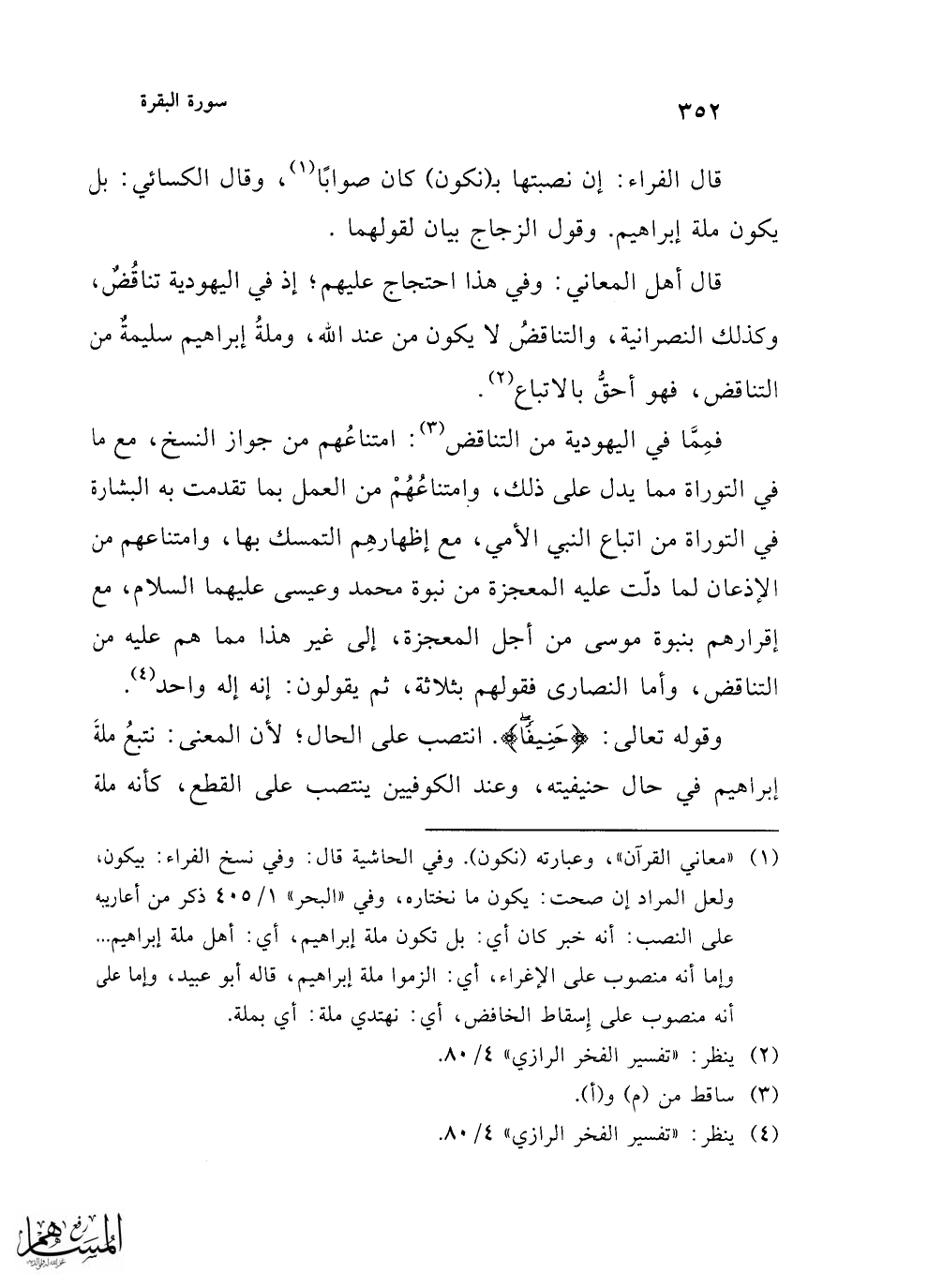 (¬1) "معاني القرآن"، وعبارته (نكون). وفي الحاشية قال: وفي نسخ الفراء: بيكون، ولعل المراد إن صحت: يكون ما نختاره، وفي "البحر" 1/ 405 ذكر من أعاريبه على النصب: أنه خبر كان أي: بل تكون ملة إبراهيم، أي: أهل ملة إبراهيم ... وإما أنه منصوب على الإغراء، أي: الزموا ملة إبراهيم، قاله أبو عبيد، وإما على أنه منصوب على إِسقاط الخافض، أي: نهتدي ملة: أي بملة.
