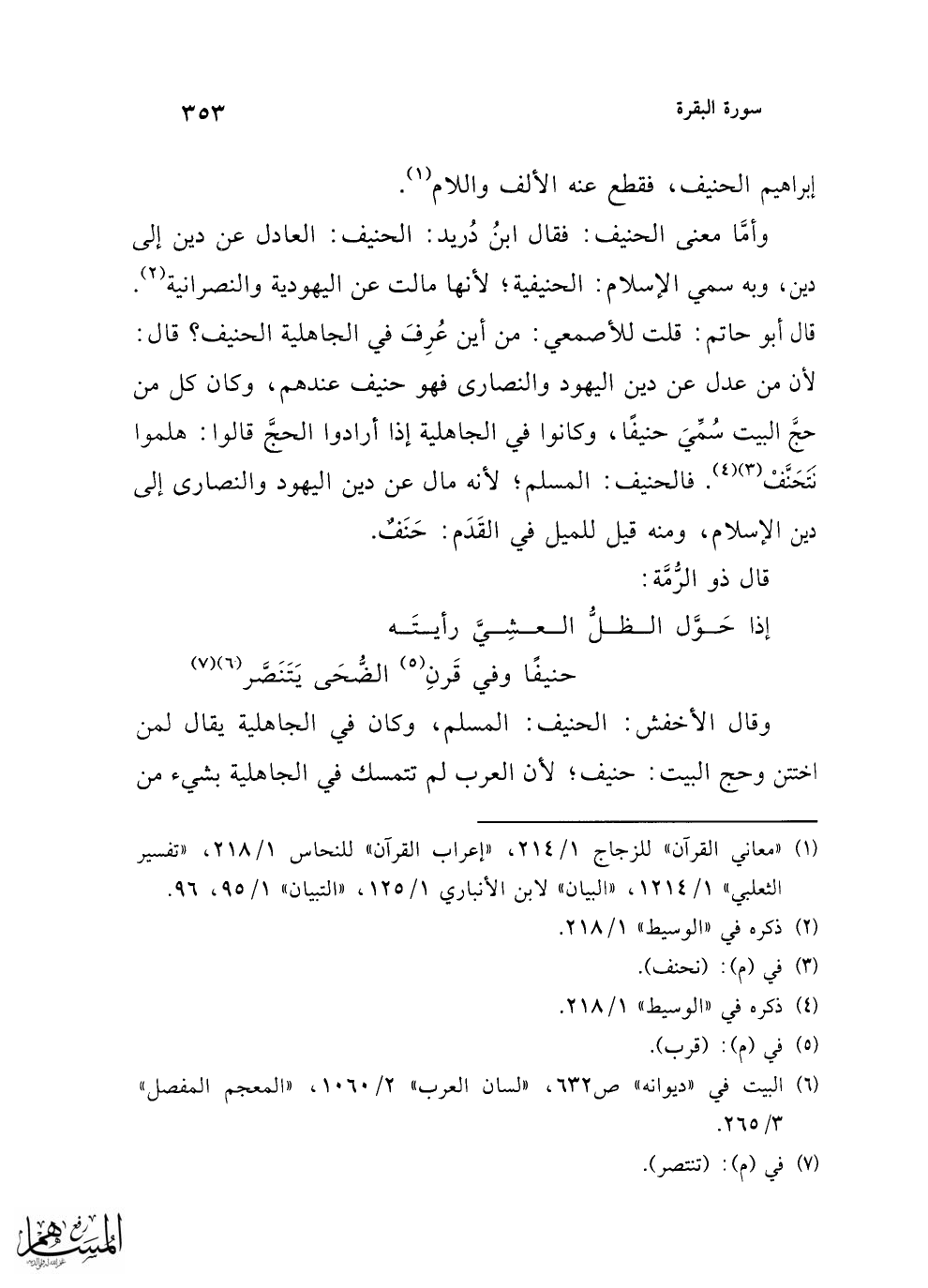 (¬1) "معاني القرآن" للزجاج 1/ 214، "إعراب القرآن" للنحاس 1/ 218، "تفسير الثعلبي" 1/ 1214، "البيان" لابن الأنباري 1/ 125، "التبيان" 1/ 95، 96.